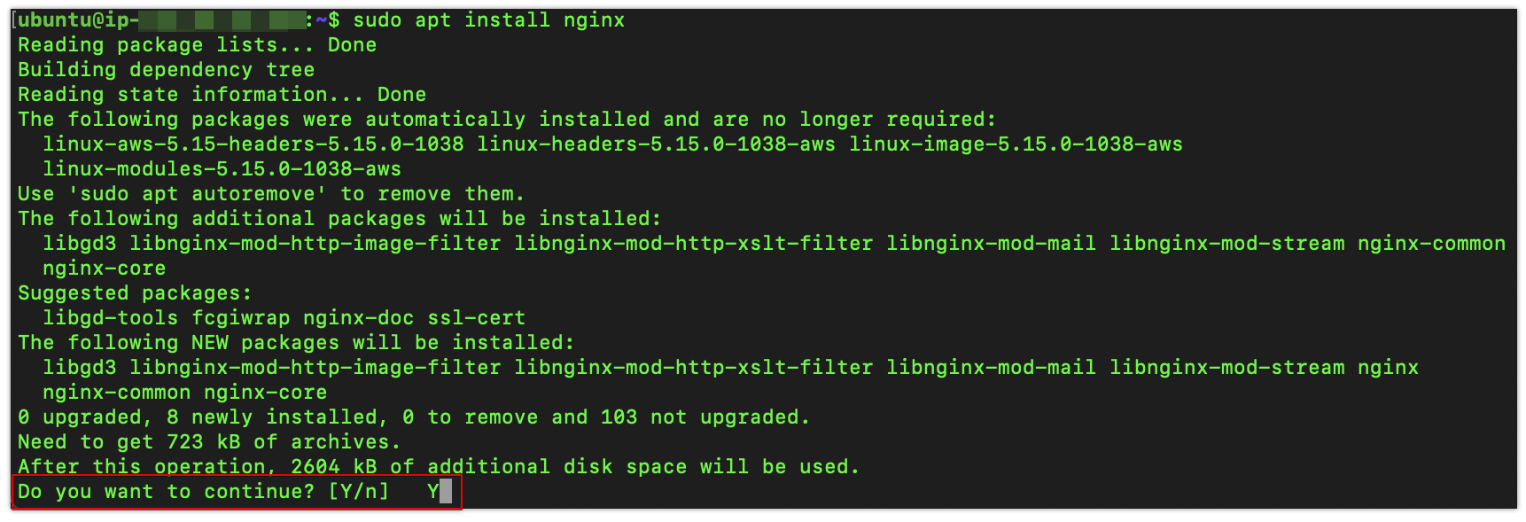 서버 터미널에서 위 명령어를 입력해주자. 계속 할꺼냐는 물음이 나오는데 Y 를 입력후 엔터를 눌러주자.