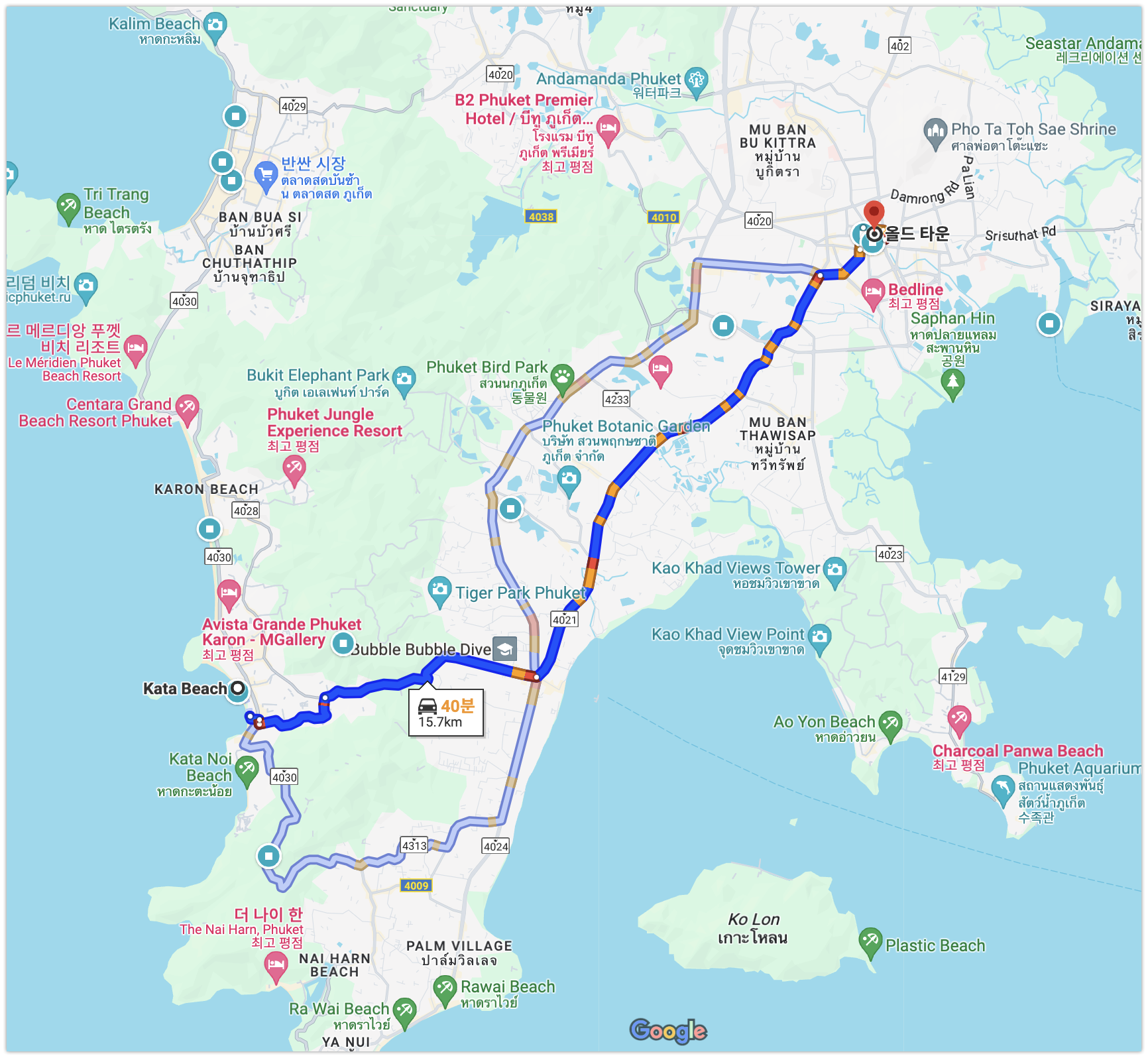 이전에 카론해변부터 카타해변을 보며 간단하게 푸켓에서 유명한 해변을 둘러보았습니다. 이제 다시 숙소가 있는 올드타운쪽으로 복귀 해야합니다. 바로 숙소로 가진 않고 올드타운 시내를 같이 둘러볼 예정입니다