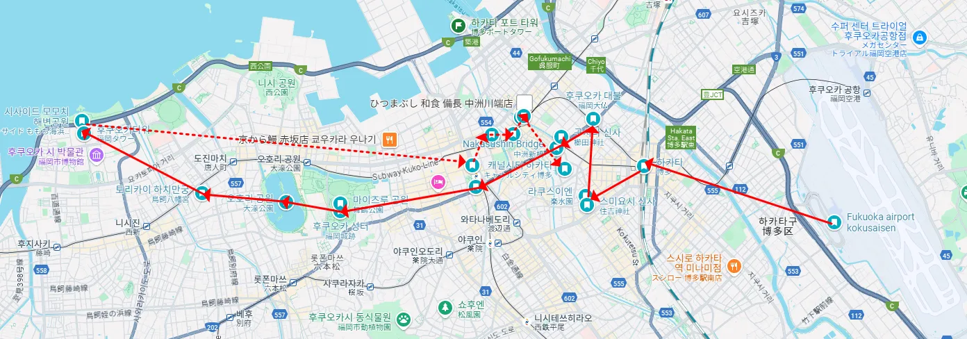 후쿠오카에 여행 계획을 이렇다. 공항에 도착해서 횡으로 동에서 서쪽으로 이동, 지점간 위치들이 가까워서 공항에서 하카타역 오는거 제외하고는 모두 도보이동이다. 여행 코스 검색해보면 2박3일 / 3박 4일 코스로 짜던데 아무리 봐도 하루면 딱일것 같아서 모두 당일 일정이다. 당일일정이 가능한 이유는 캐리어 없음(배낭) / 밥 안먹음 / 화장실 안감 / 도보 이동 특성때문인 것 같다..