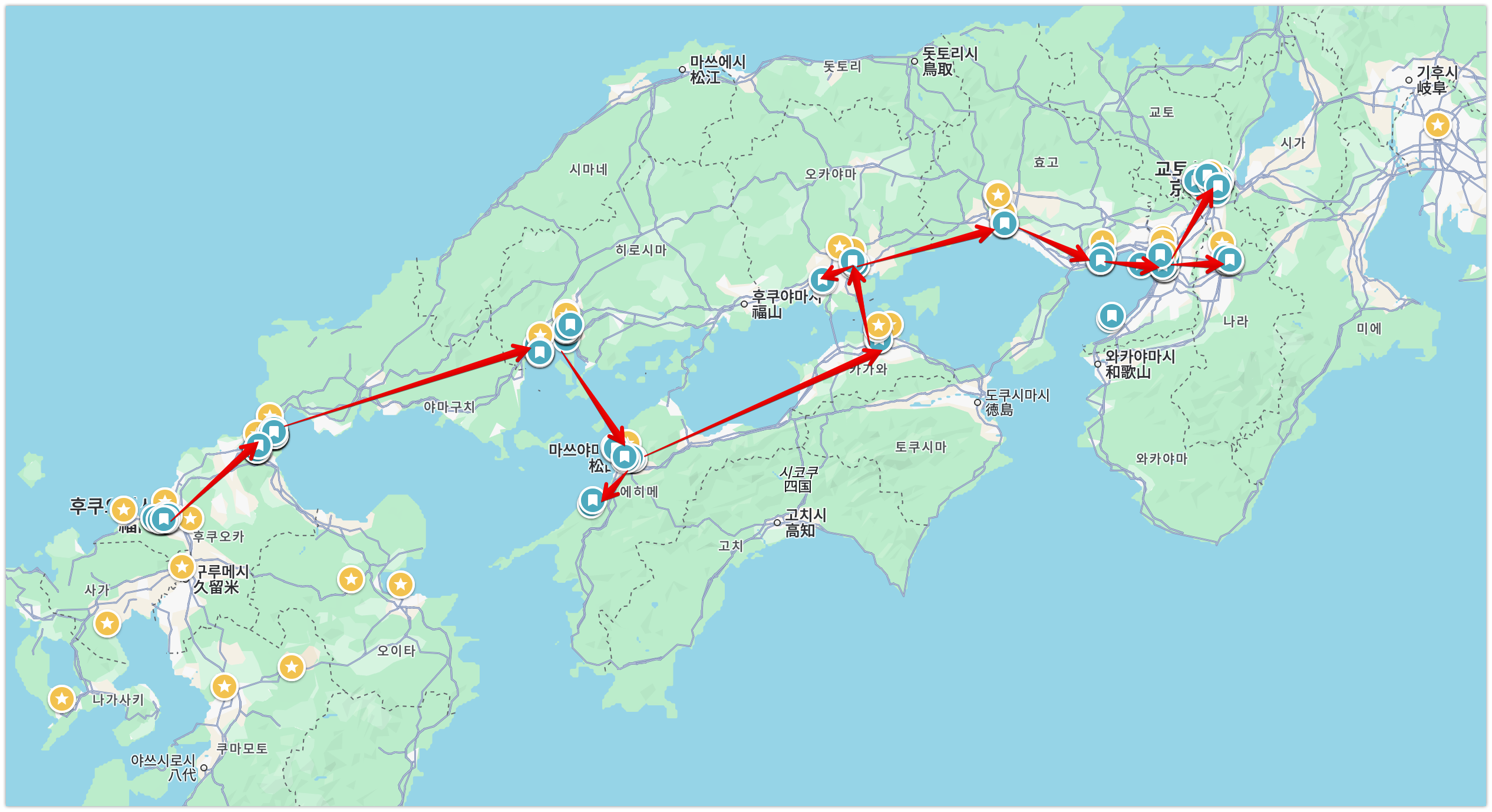 휴가가 많이 남아서, 연휴가 없는 주를 골라서 5월에 일본에 혼자 다녀올 계획을 세웠다. 평일 5일 + 앞뒤로 주말을 포함하고 거기다 +1일 더해서 총 9박 10일간 일본을 어떻게 다녀볼까 고민한 결과 위 경로로 가기로 결정했다.
