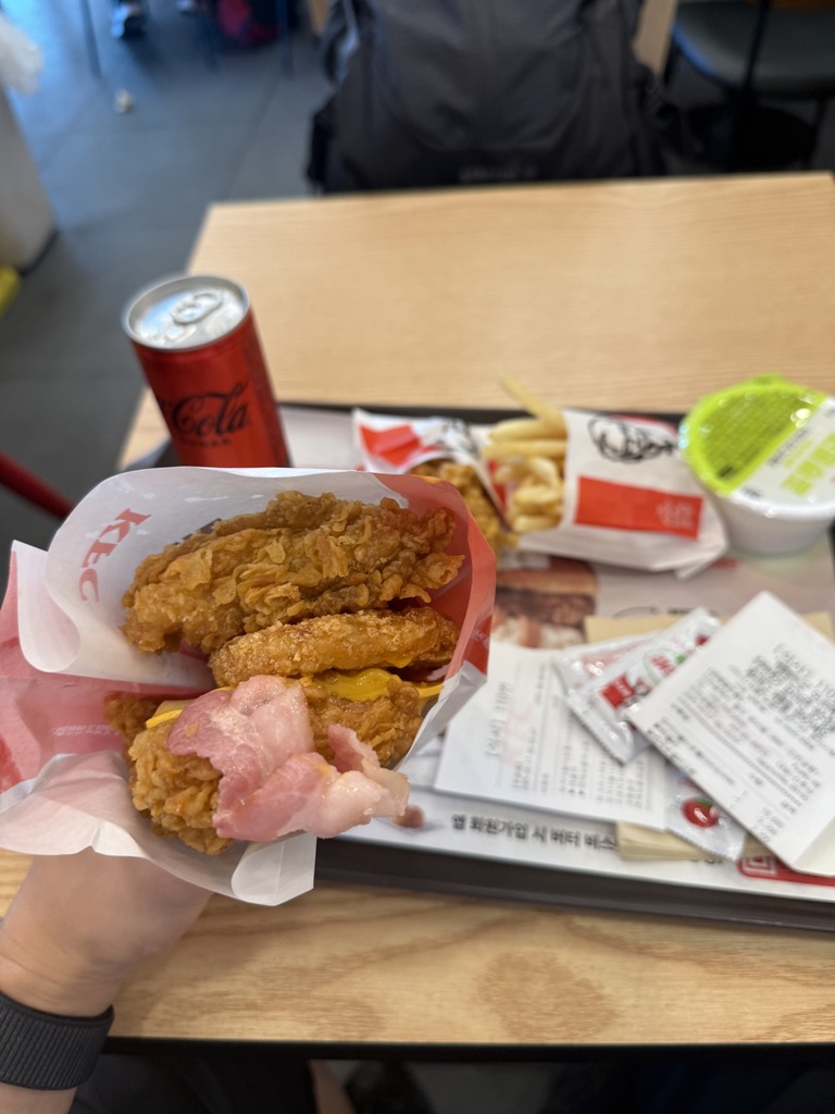 09:35분 비행기였는데 06:10 쯤 공항에 도착했다. 뉴스보면 항상 인천공항 붐비다고2시간전도 사람들 붐비다는걸 하도 많이봐서 최소 3시간 전에는 가는편인데 06:30 쯤에 이미 출국수속을 마쳤다... 위탁 수하물도 없고, 모바일 체크인도 하고, 스마트패스도 등록해서 그런지... 유일하게 시간 소요 된건 보안 검색대 3분정도가 소요됐다. 할게 없어서 일단 출국장에 있는 KFC에서 밥을 먹었다. 후쿠오카 도착하고 저녁될때까지 따로 밥을 먹지 않을꺼같아서 미리 밥을 먹기로 했다.