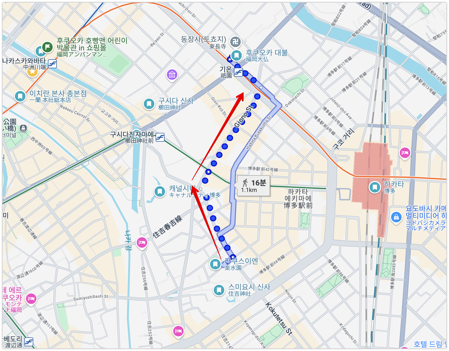 스미요시 신사와 하쿠스이엔을 빠르게 보고 다음으로 이동할 곳은 후쿠오카 대불이 있는 도초지였다. 가는길은 도보로 15분 정도 걸으면 되는데, 가는길에 캐널시티가 있어서 들릴일이 있다면 들리면 된다. 나는 캐널시티는 밤에 방문할꺼라 건물 외관정도만 살짝 보고 지나쳣다.