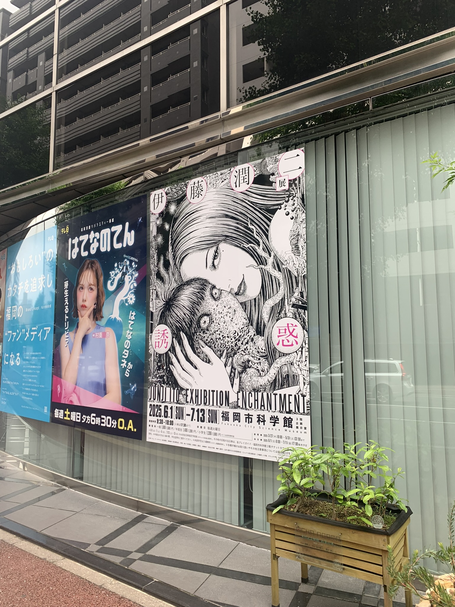 주변을 구경하면서 15분간 걸었다. 가는길에 눈길을 끌었던 건 그리 높지 않은 층고였는데도 차가 2층으로 주차되는게 신기했고, 길가다 이토준지 포스터가 있어서 찍어봤다.