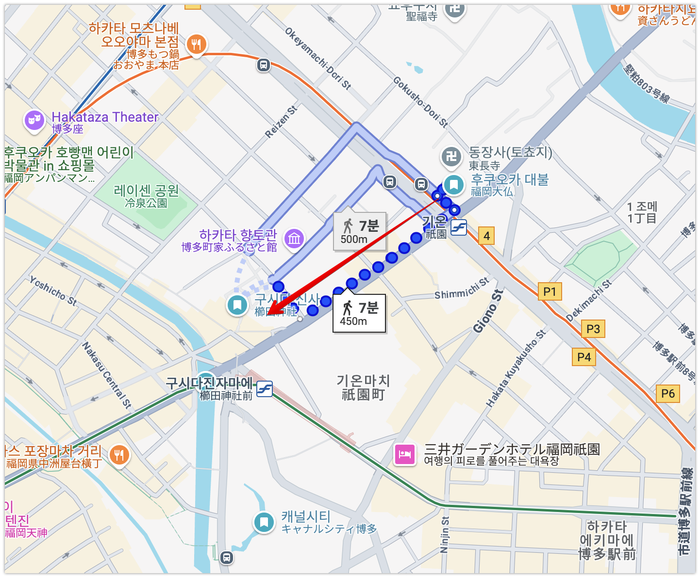 이전에 도초지를 들려 후쿠오카 대불을 보고 이제 다음 목적지인 구시다 신사로 향한다. 거리는 두블럭정도 걸으면 되는데 10분이면 도착하는 가까운 거리이다.