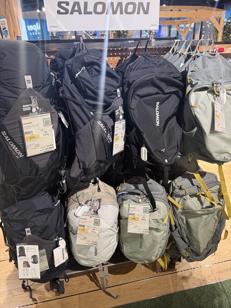 그리고 살로몬 제품들도 한국에선 품절인게 요기선 그냥 다 걸려있다... 좌측사진 아래 두번째 베이지색 살라몬 가방.. 동생이 한국에서 구매하려고 재입고 알람 해놓은건데 요긴 걸려있더라구..후쿠오카 에서 쇼핑할분들꼐 도움이 되시길.. 저는 10일간 여행 해야하는데 첫 여행지가 이곳이라 구매는 못했습니다..