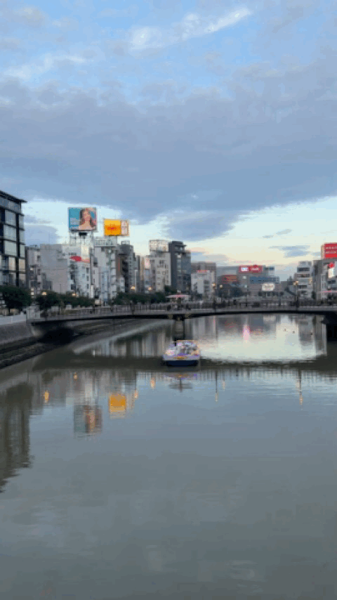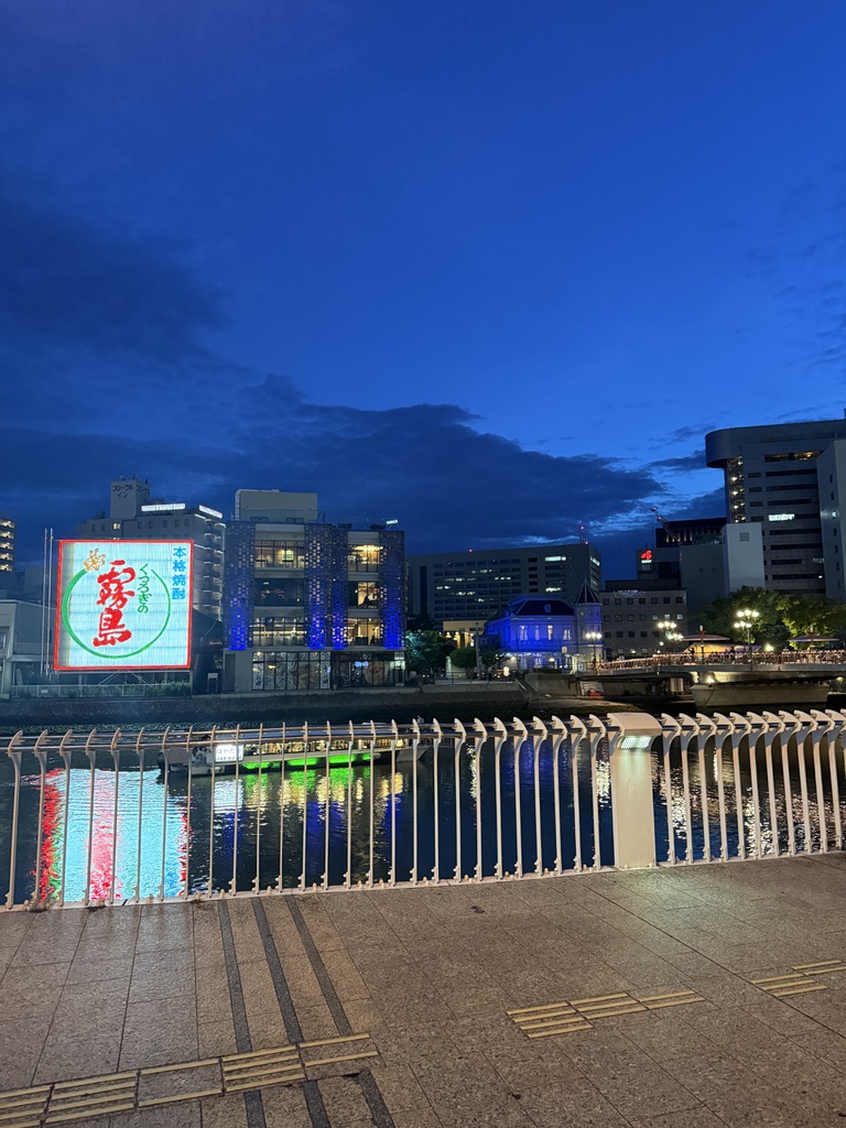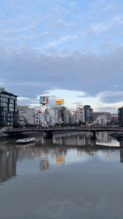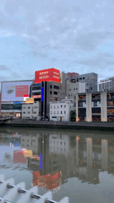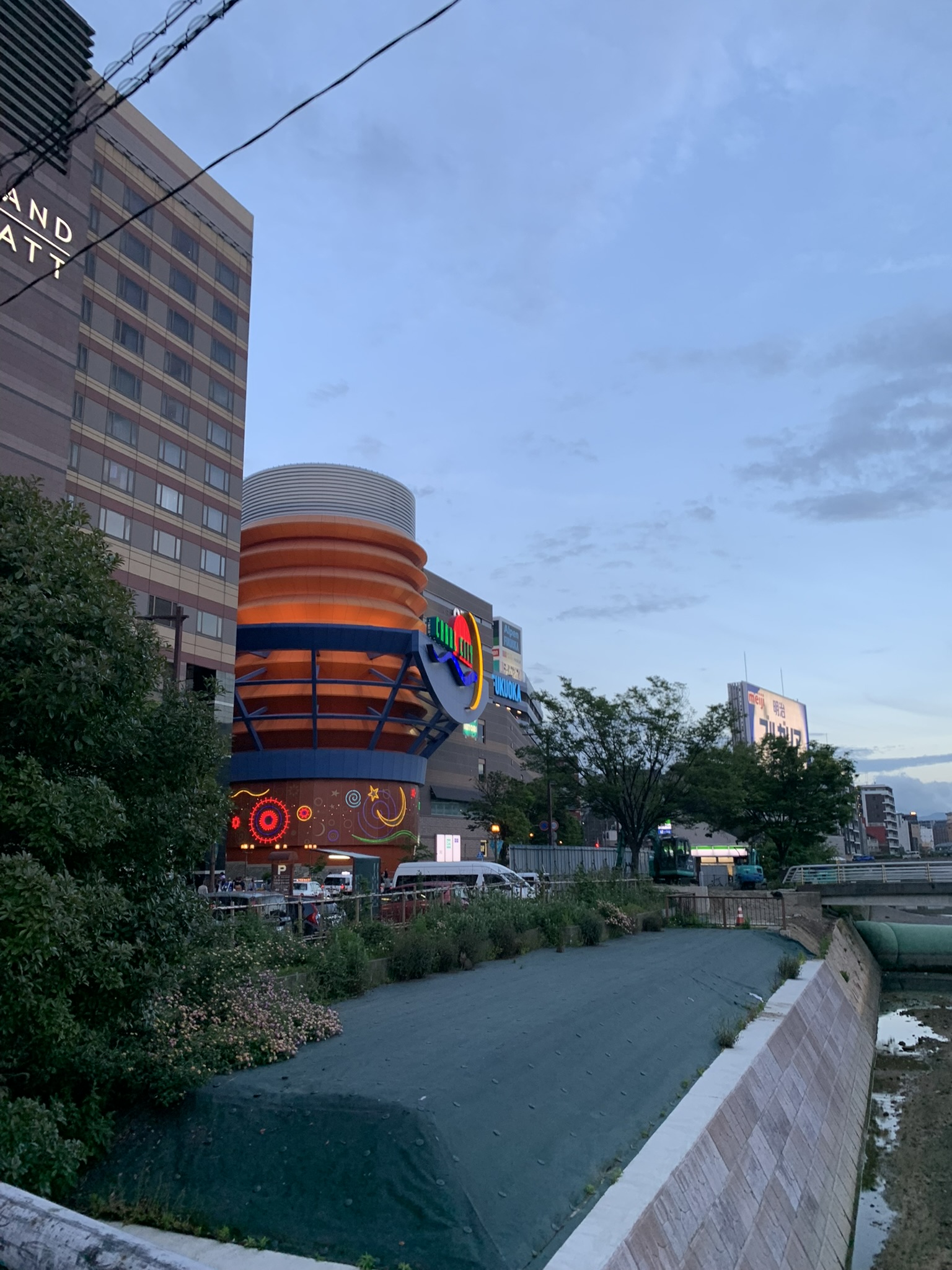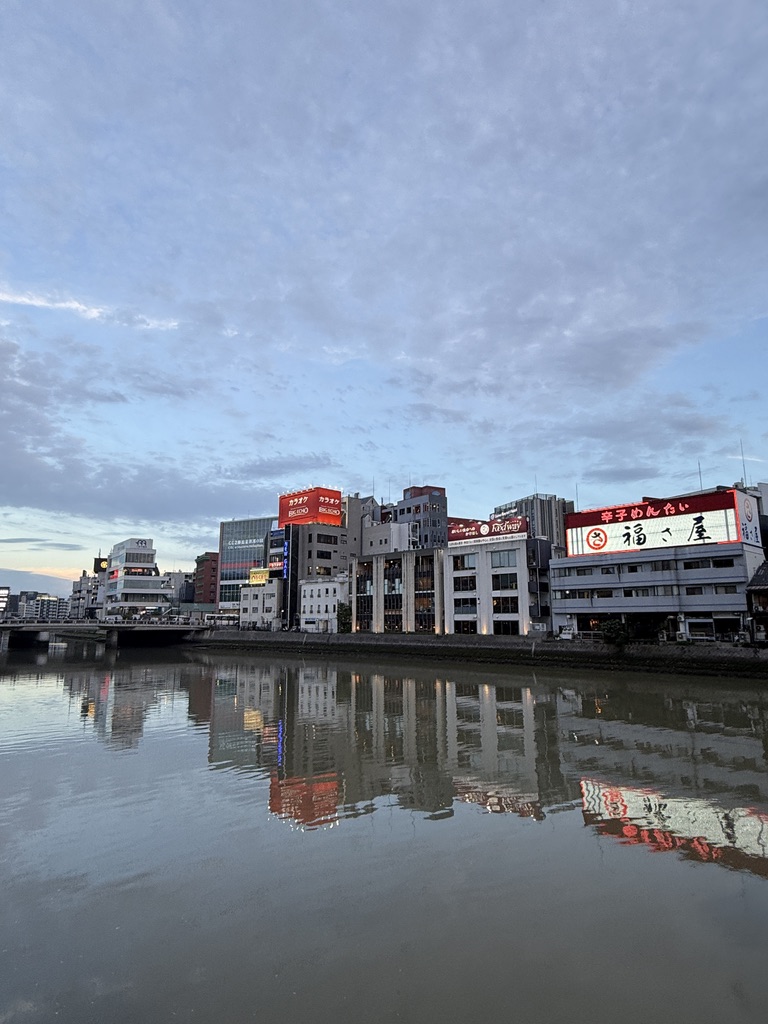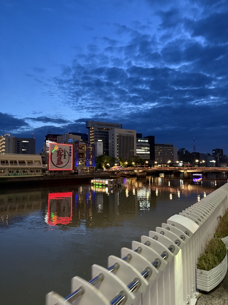 해가 지기 시작했다. 이때는 이미 여러 곳을 다녀오고 난 뒤였는데, 이때가 약 19:00 경이었다. 방문했을때가 5월이었는데도 해가 아주 늦게 지네.. 강가에서 둘러보면 멀리 캐널시티도 보인다. 건물이 눈에 띄게 생겨서 한눈에 알아볼 수 있는데, 나는 처음에 저 나선형 건축물때문에 안에 워터 파크가 있는줄 알았다.. 가보니까 그런건 아니더라고..