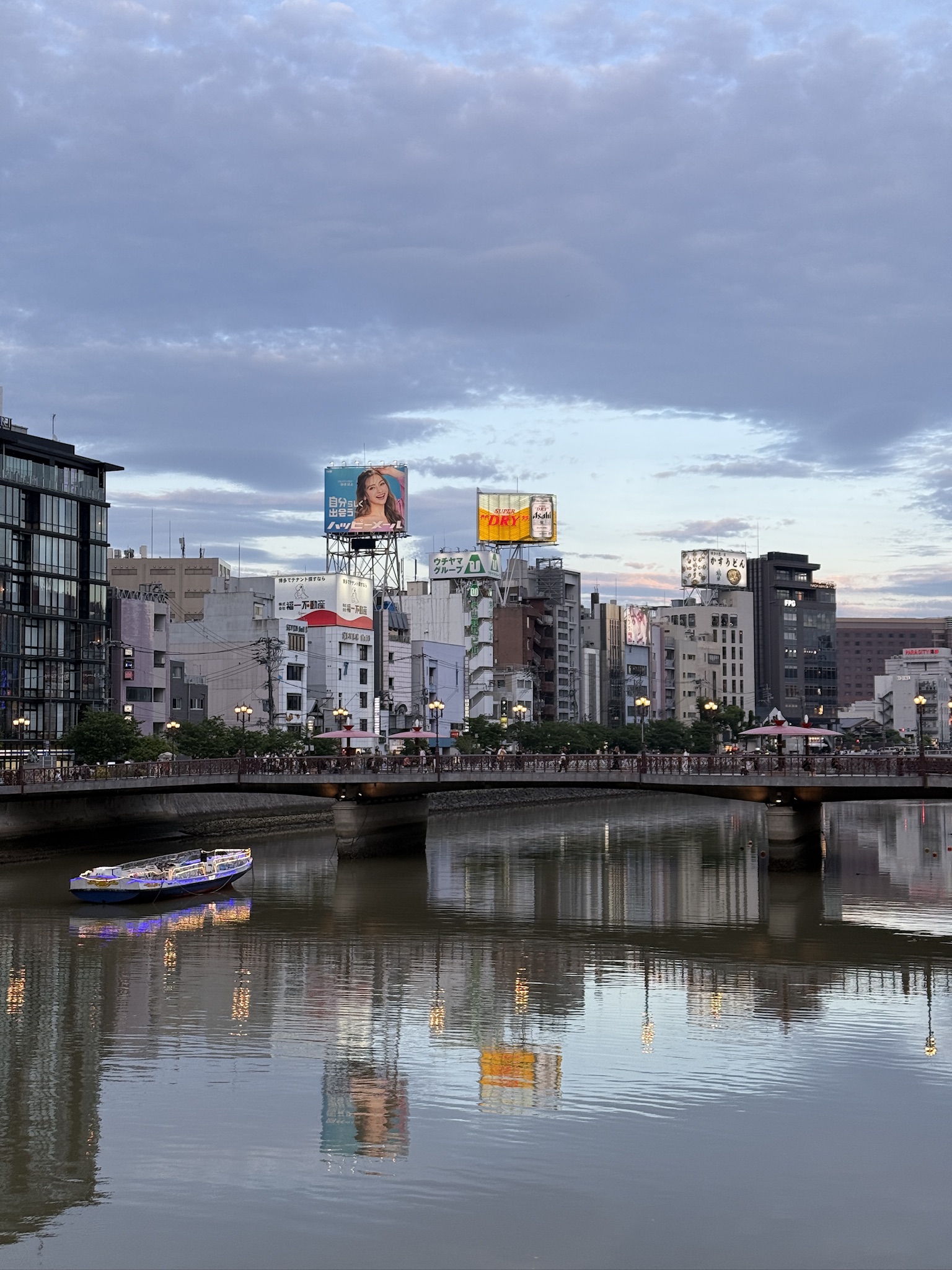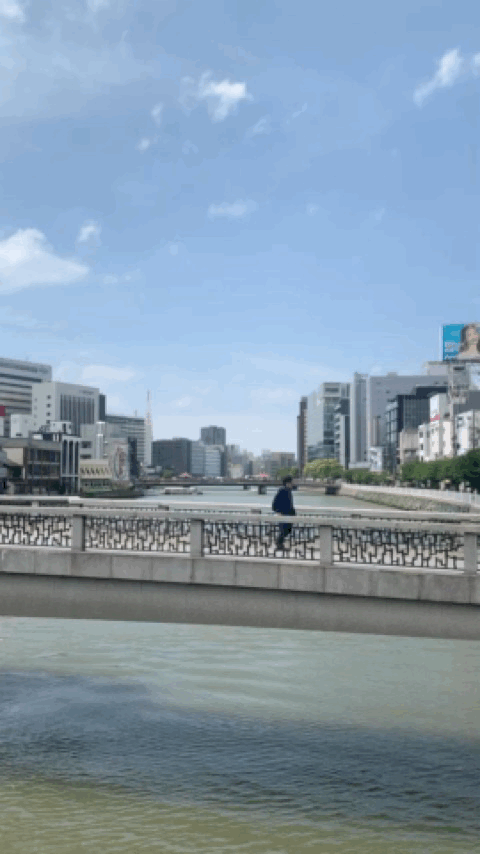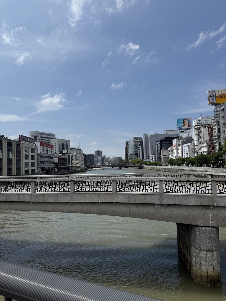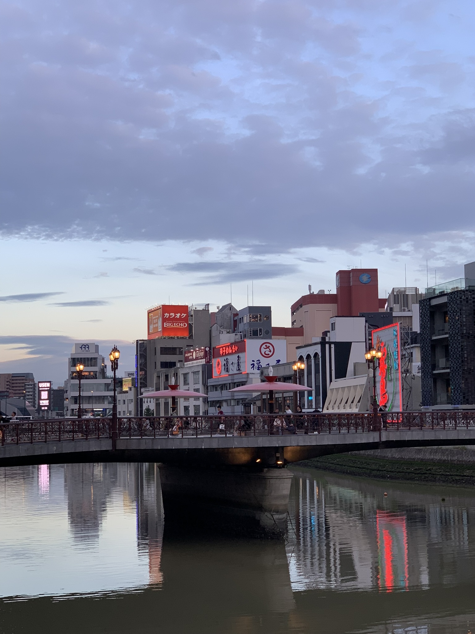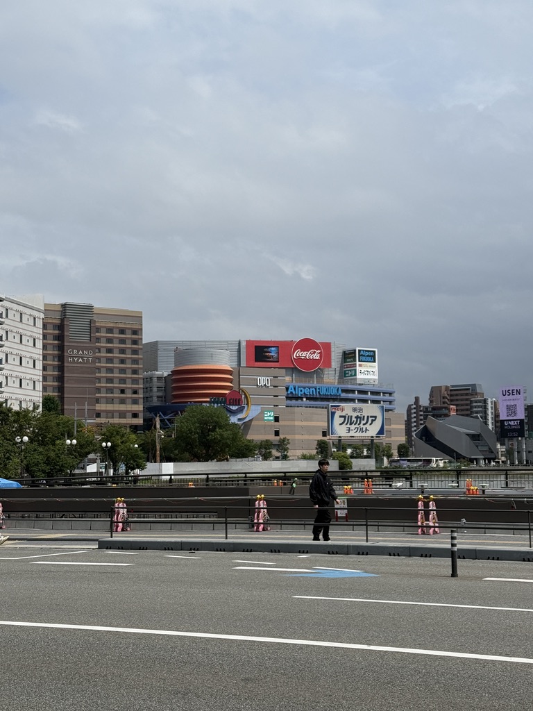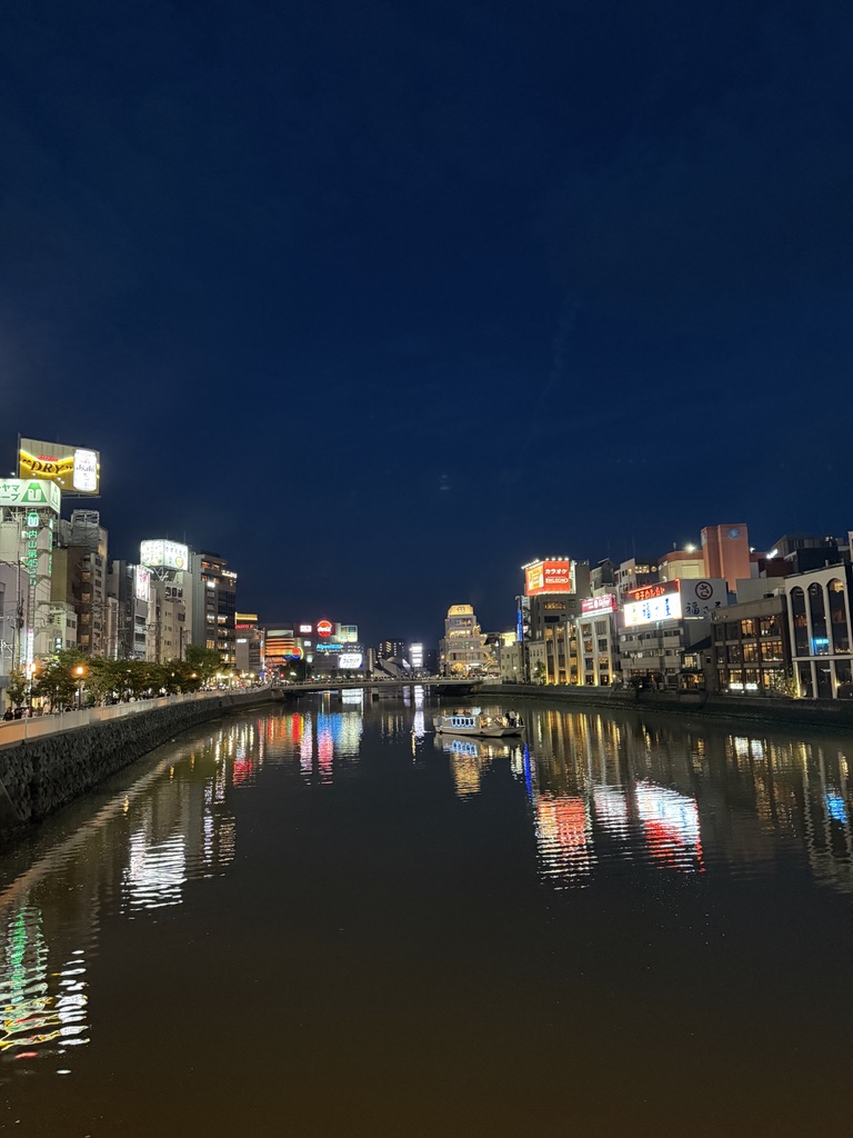 해가 지기 시작했다. 이때는 이미 여러 곳을 다녀오고 난 뒤였는데, 이때가 약 19:00 경이었다. 방문했을때가 5월이었는데도 해가 아주 늦게 지네.. 강가에서 둘러보면 멀리 캐널시티도 보인다. 건물이 눈에 띄게 생겨서 한눈에 알아볼 수 있는데, 나는 처음에 저 나선형 건축물때문에 안에 워터 파크가 있는줄 알았다.. 가보니까 그런건 아니더라고..