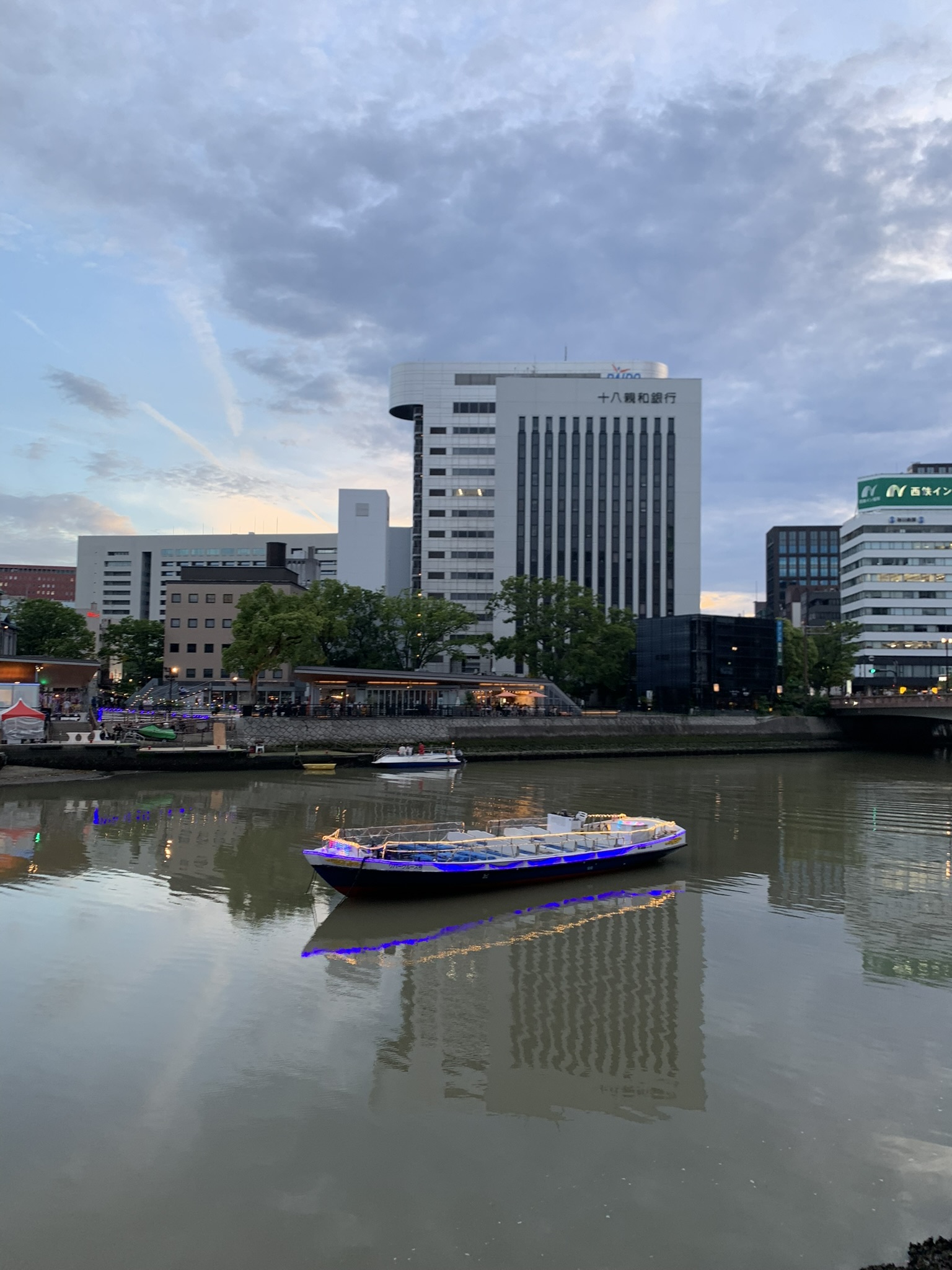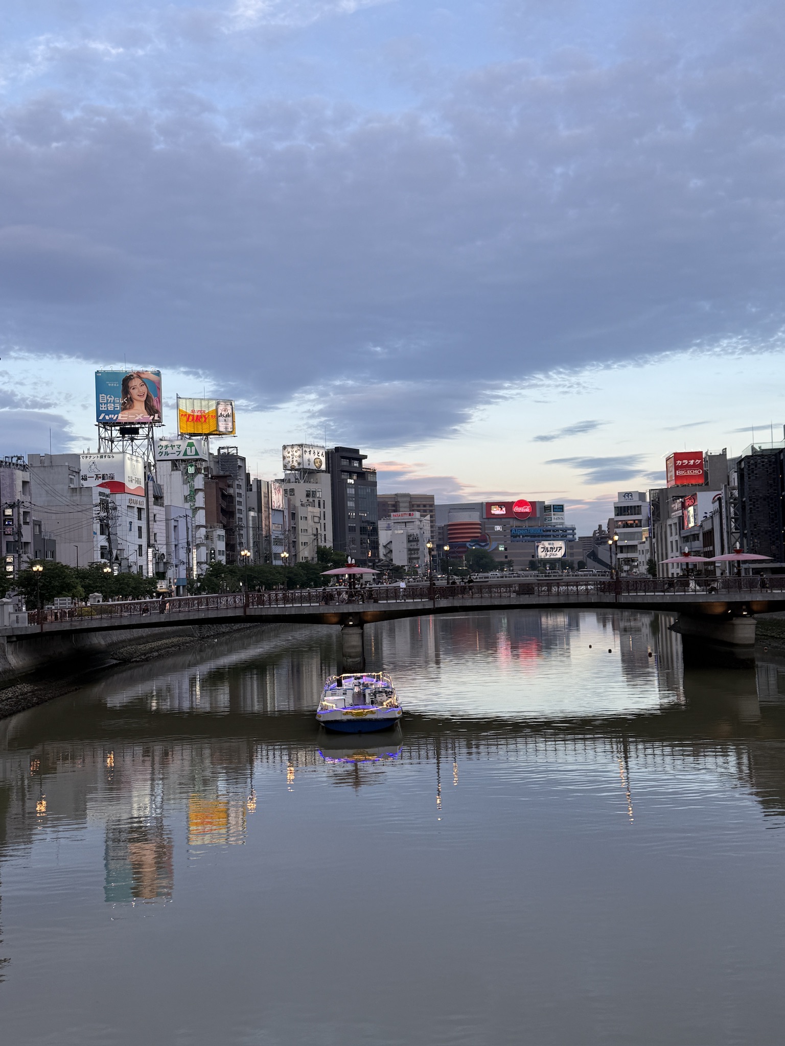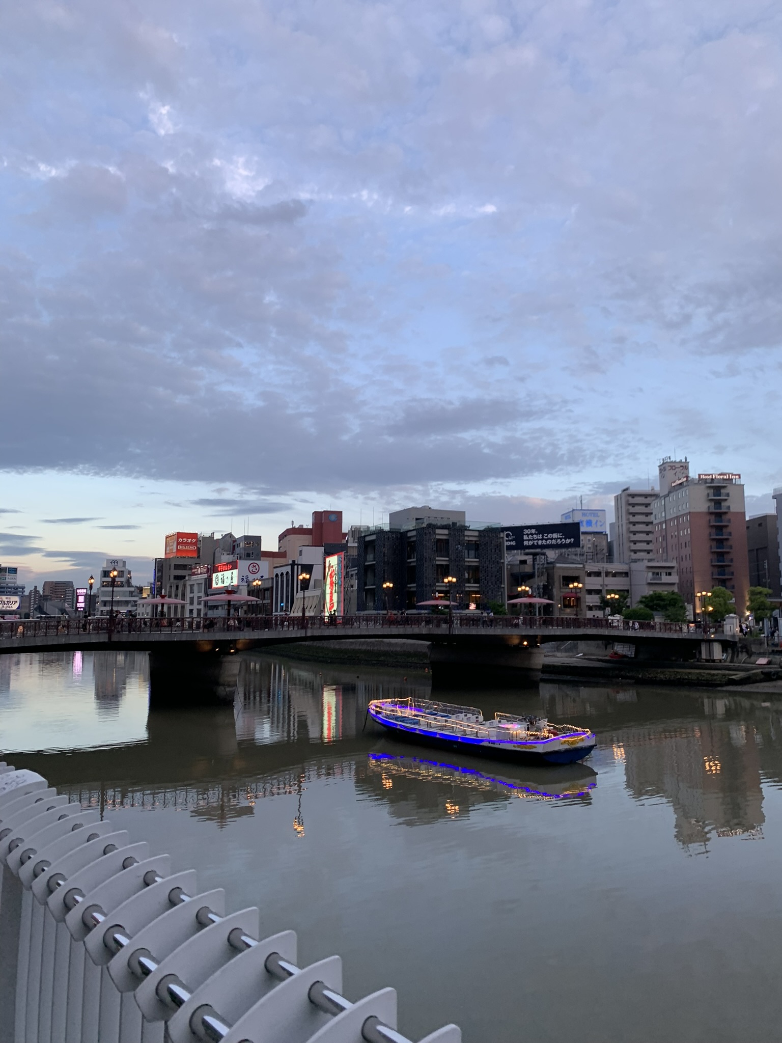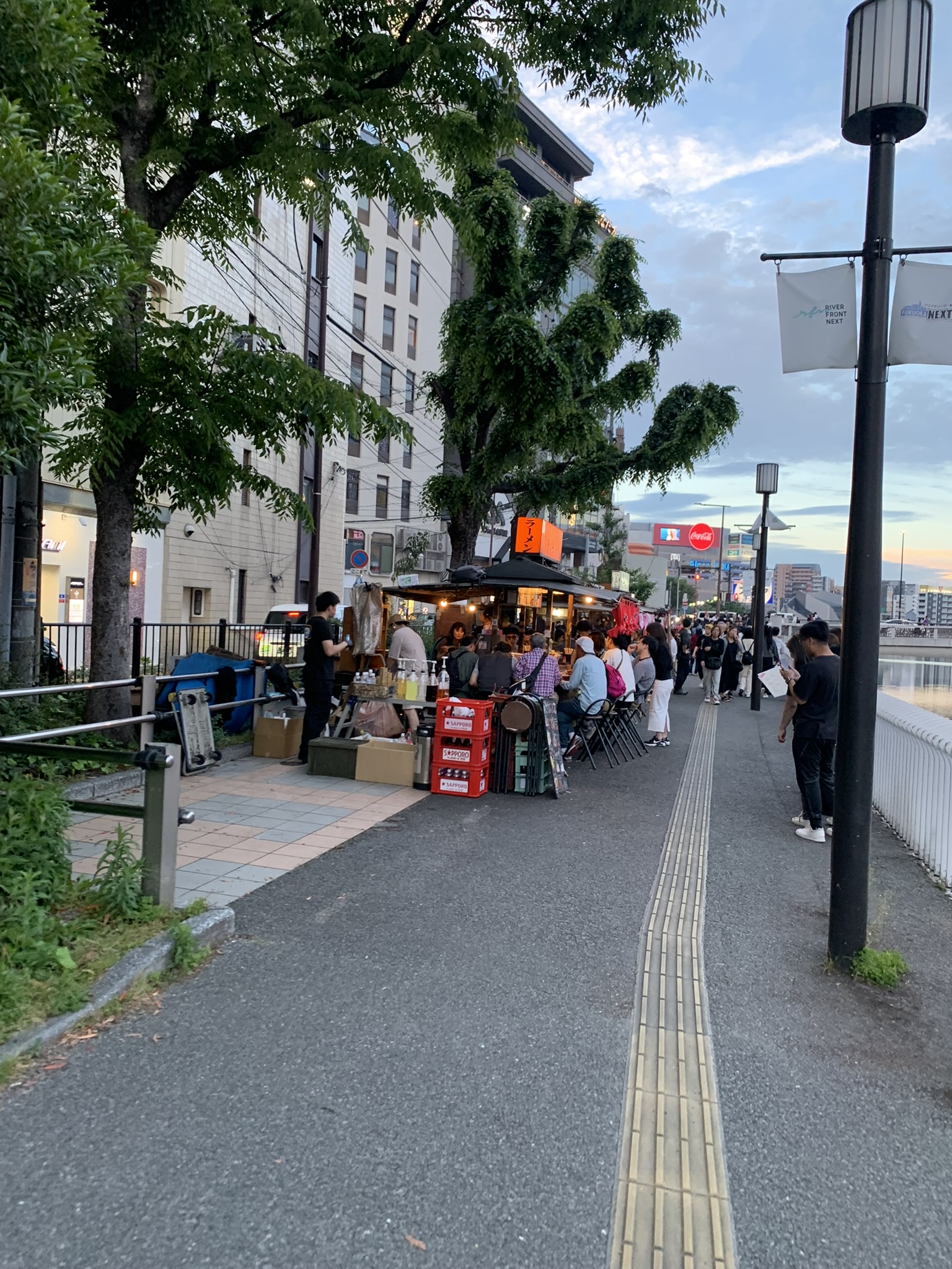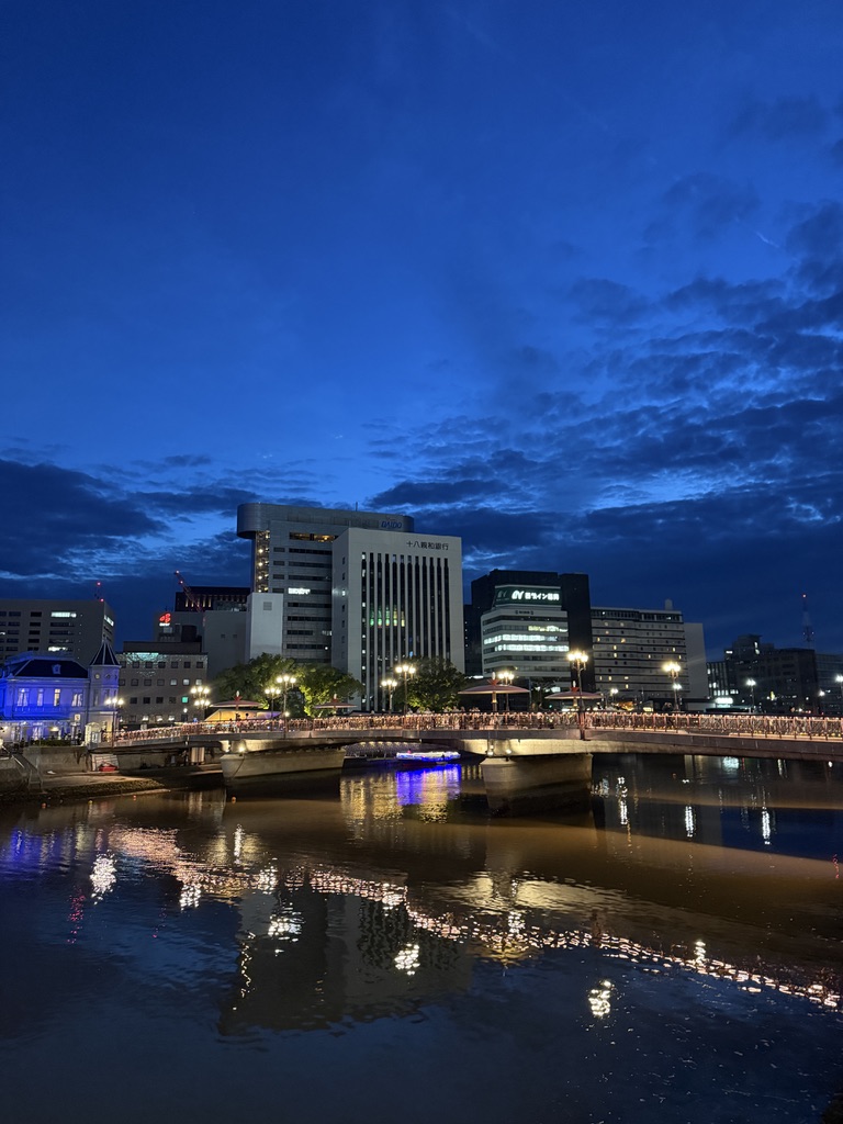 해가 지기 시작했다. 이때는 이미 여러 곳을 다녀오고 난 뒤였는데, 이때가 약 19:00 경이었다. 방문했을때가 5월이었는데도 해가 아주 늦게 지네.. 강가에서 둘러보면 멀리 캐널시티도 보인다. 건물이 눈에 띄게 생겨서 한눈에 알아볼 수 있는데, 나는 처음에 저 나선형 건축물때문에 안에 워터 파크가 있는줄 알았다.. 가보니까 그런건 아니더라고..