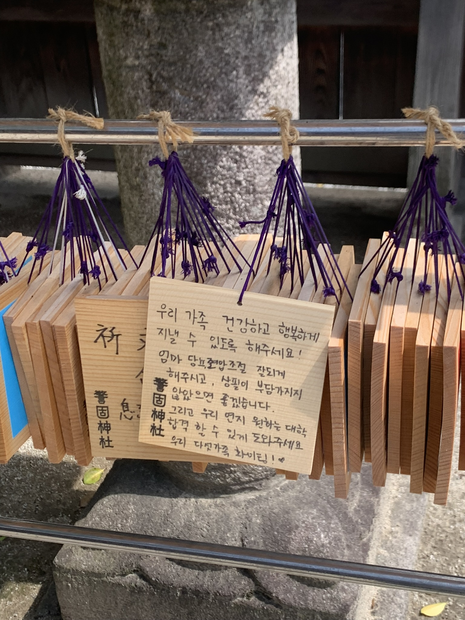 보통 일본 신사오면 에마에 소원써서 거는게 주요 컨텐츠인데 지나다닐때마다 한글이 있는지 찾아봤는데 케고 신사에서 하나 발견했다. 나무 우측에 작게 새 나무가 자라던데 원래 나무가 저런건지 접목을 한건지 궁금했다.