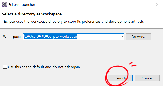 런쳐가 실행되고 워크스페이스를 어디다 둘지 디렉토리 설정을 할 수 있다. 그냥 기본설정으로 두고 진행하기위해 바로 Launch 버튼을 눌러준다. 경로를 바꿀사람은 바꿔도 무방하다.