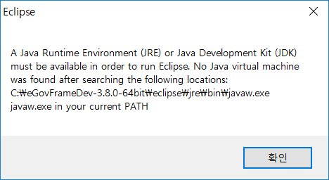A Java Runtime Environment (JRE) or Java Development Kit (JDK) must be available in order to run Eclipse. No Java virtual machine was found after searching the following locations; C:\eGovFrameDev-3.8.0-64bit\eclipse\jre\bin\javaw.exe