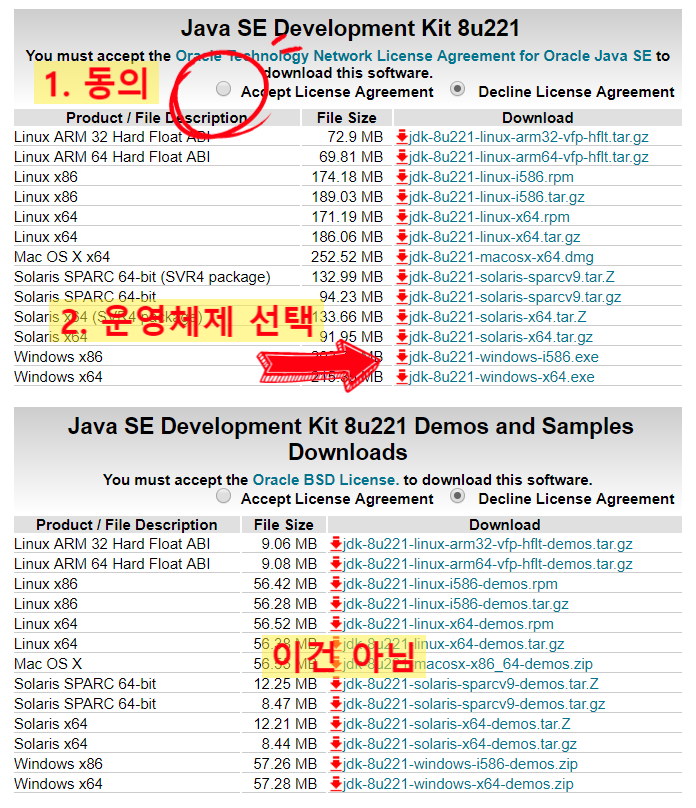위 링크를 접속해서 아래로 내리면 위 사진과 같은 화면이 나오는데 약관에 동의해주고 운영체제에 맞게 JDK를 다운받는다.