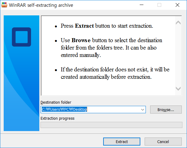 실행하면 이런놈이 나온다. Destination folder 경로에 압축을 풀 경로를 지정해준다. 나는 그냥 바탕화면에 풀겠음으로 바로 Extract 버튼을 눌러준다.