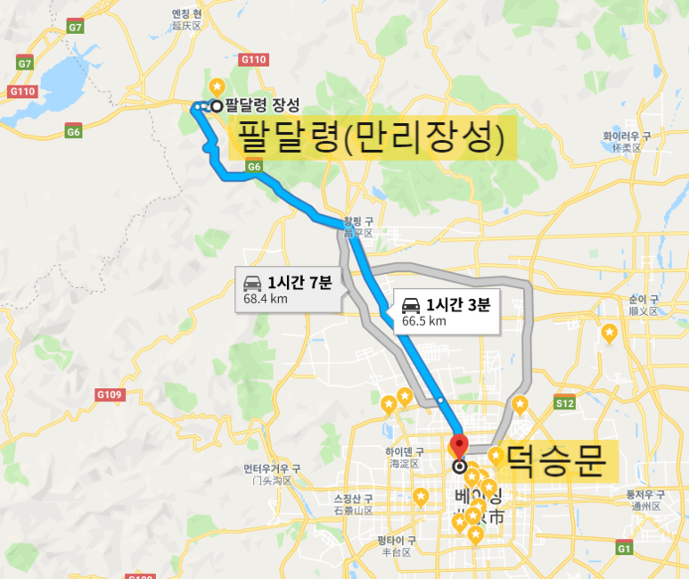 베이징 시내인 덕승문 정류장에서 팔달령까지는