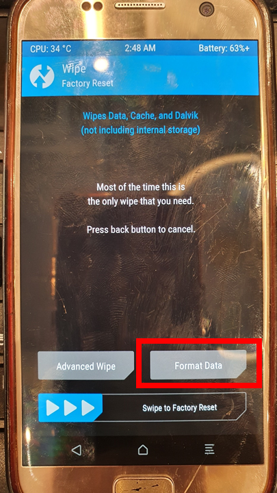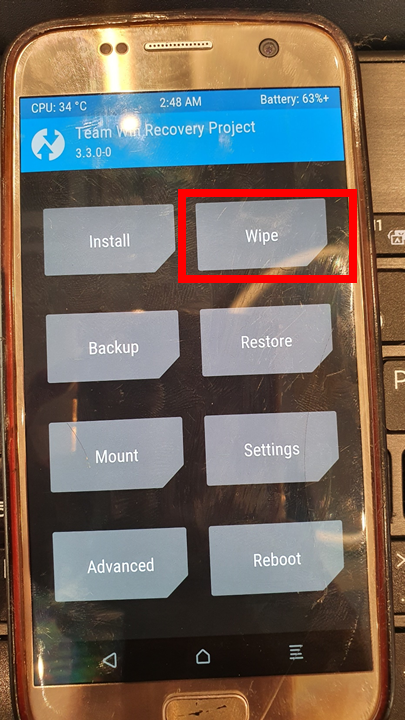 1. Wipe버튼 클릭 (이거 진행하면 핸드폰 내부 데이터는 다 포맷됨으로 자료 백업할 꺼면 조용히 리붓하여 휴대폰을 재부팅 시킨다.