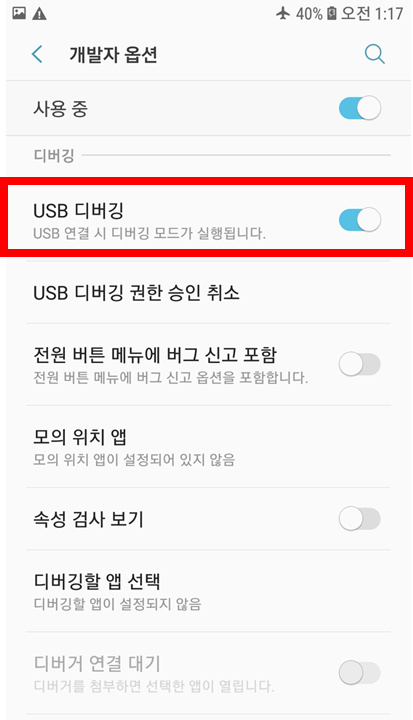 3. USB 디버깅 모드 활성화 (이것도 개발자 옵션 메뉴에 있음)
