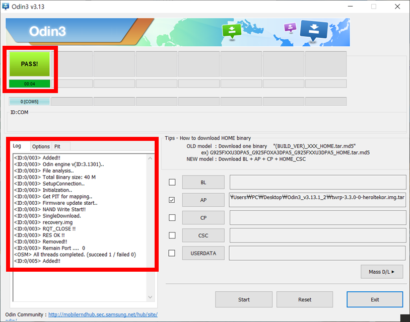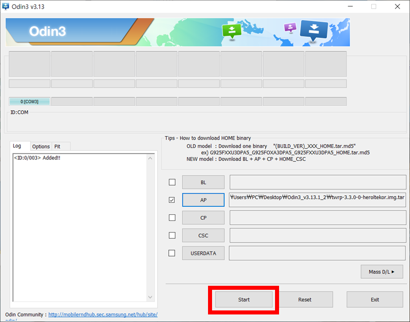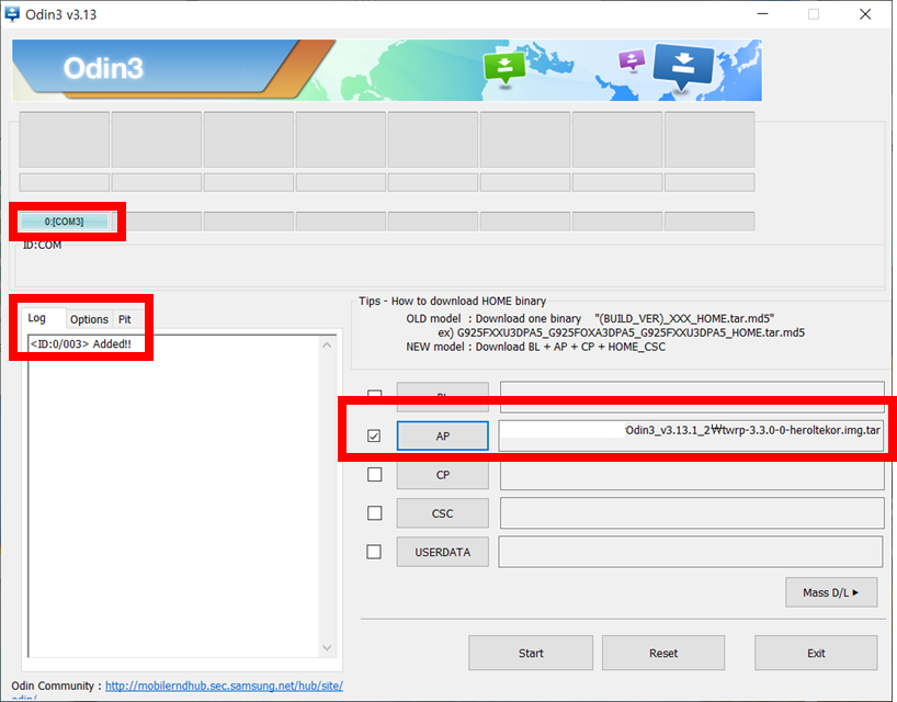 오딘이 켜져있는 상태로 다운로드 모드 상태에 진입한 휴대폰을 USB로 연결하면 연결된 COM port가 인식되고 Log창에 Added! 메시지가 출력된다. 그리고 우측 AP버튼을 눌러 다운받은 TWRP .tar 파일을 추가해준다.