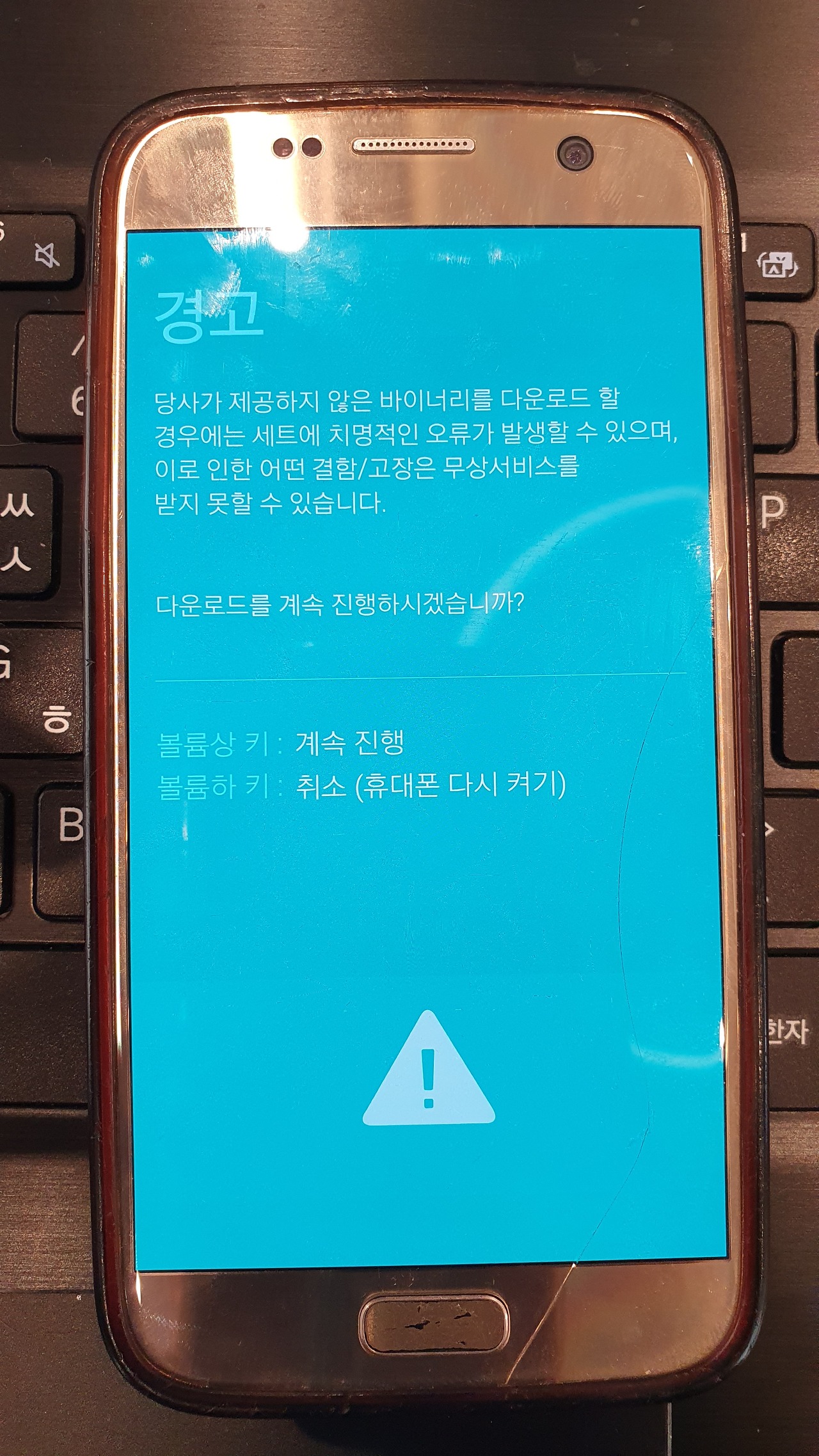 1. 볼륨키(상) + 홈키 + 전원키를 동시에 꾹~ 누르고 있으면 다운로드 모드로 부팅이 된다.