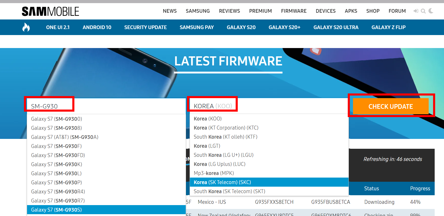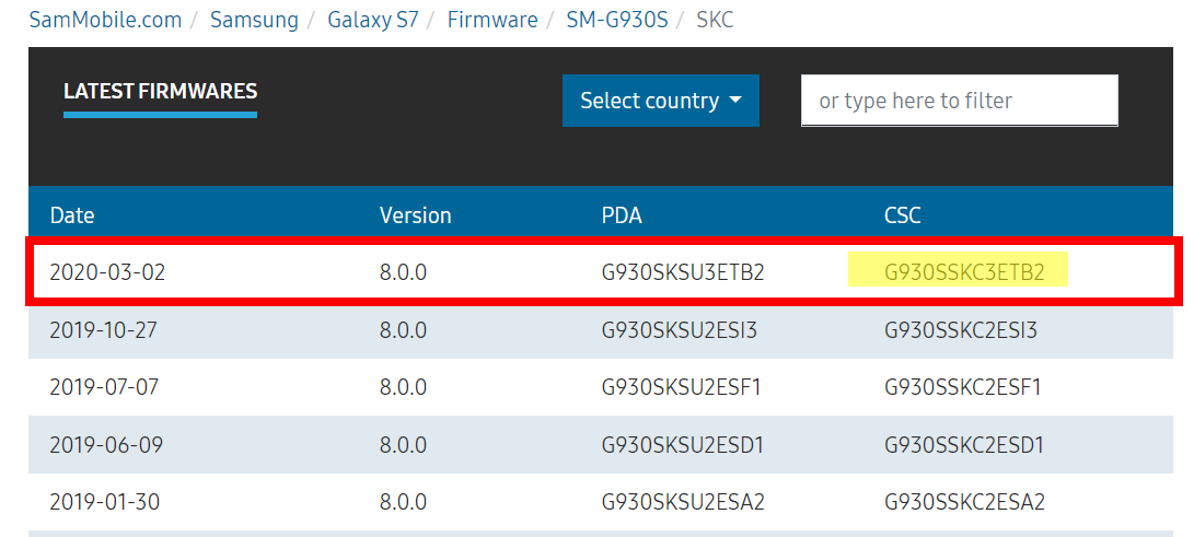 펌웨어를 검색한다. 내 휴대폰 기종은 SKT 갤럭시 S7인데 자기 휴대폰 모델명은 구글에 치면 금방 나온다. 아무튼 갤럭시S7의 모델명은 SM-G930이며 맨뒤는 통신사에 따라서 SKT = S, KT = K, LG = L이 붙는다. 자기 기종에 맞게 선택해 준다. 나는 SM-930S를 선택했다. 다음 통신사는 KOREA를 검색한다. 밑에서 자기 통신사를 선택해주면 된다. 나는 SKT이기 때문에 SKC를 선택!
