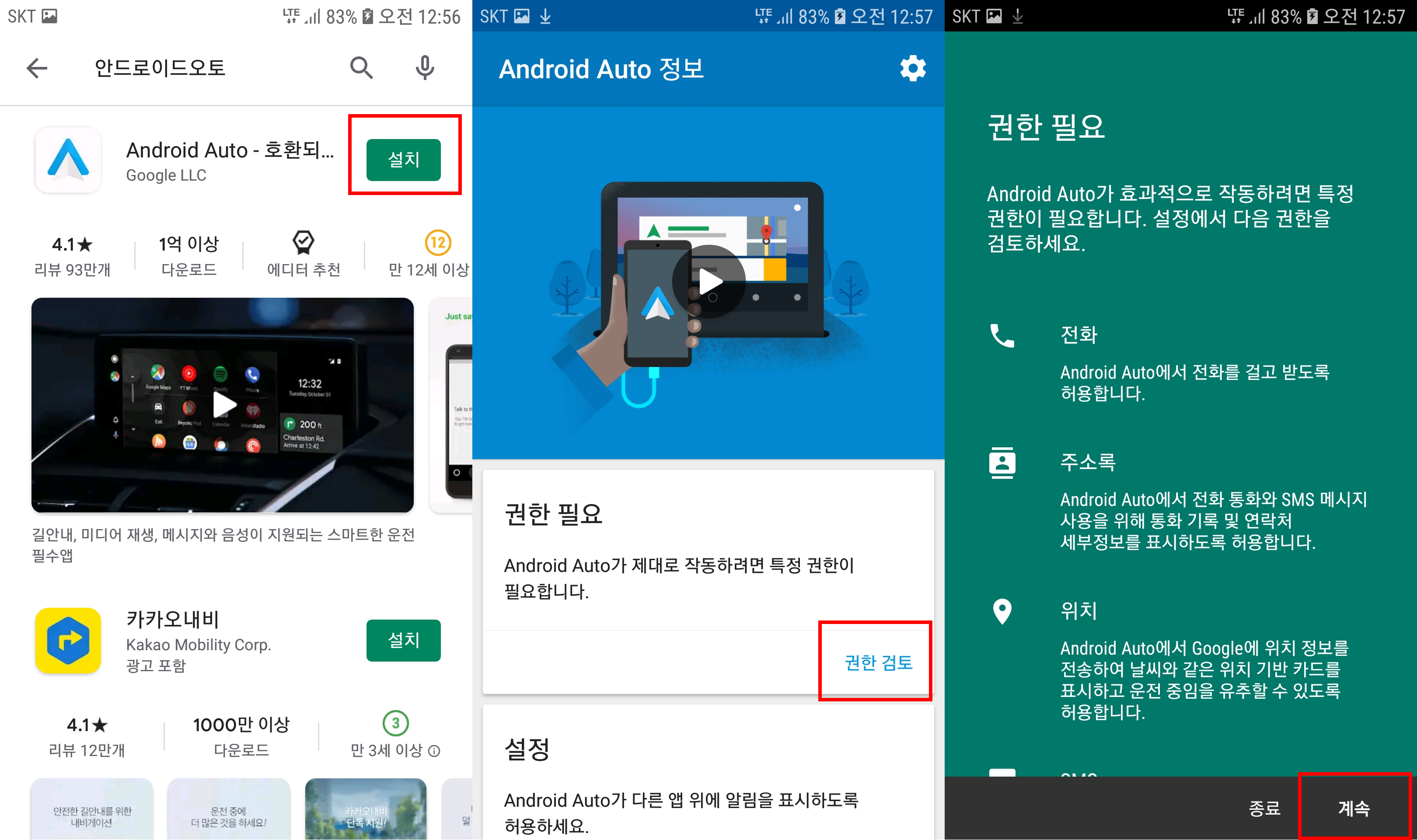 1. 구글 플레이스토어에서 안드로이드 오토를 설치해준다. 이때 밑에 카카오 네비도 같이 설치해주면 좋다. 어차피 차량이랑 연결했을때 설치하라고 나온다.