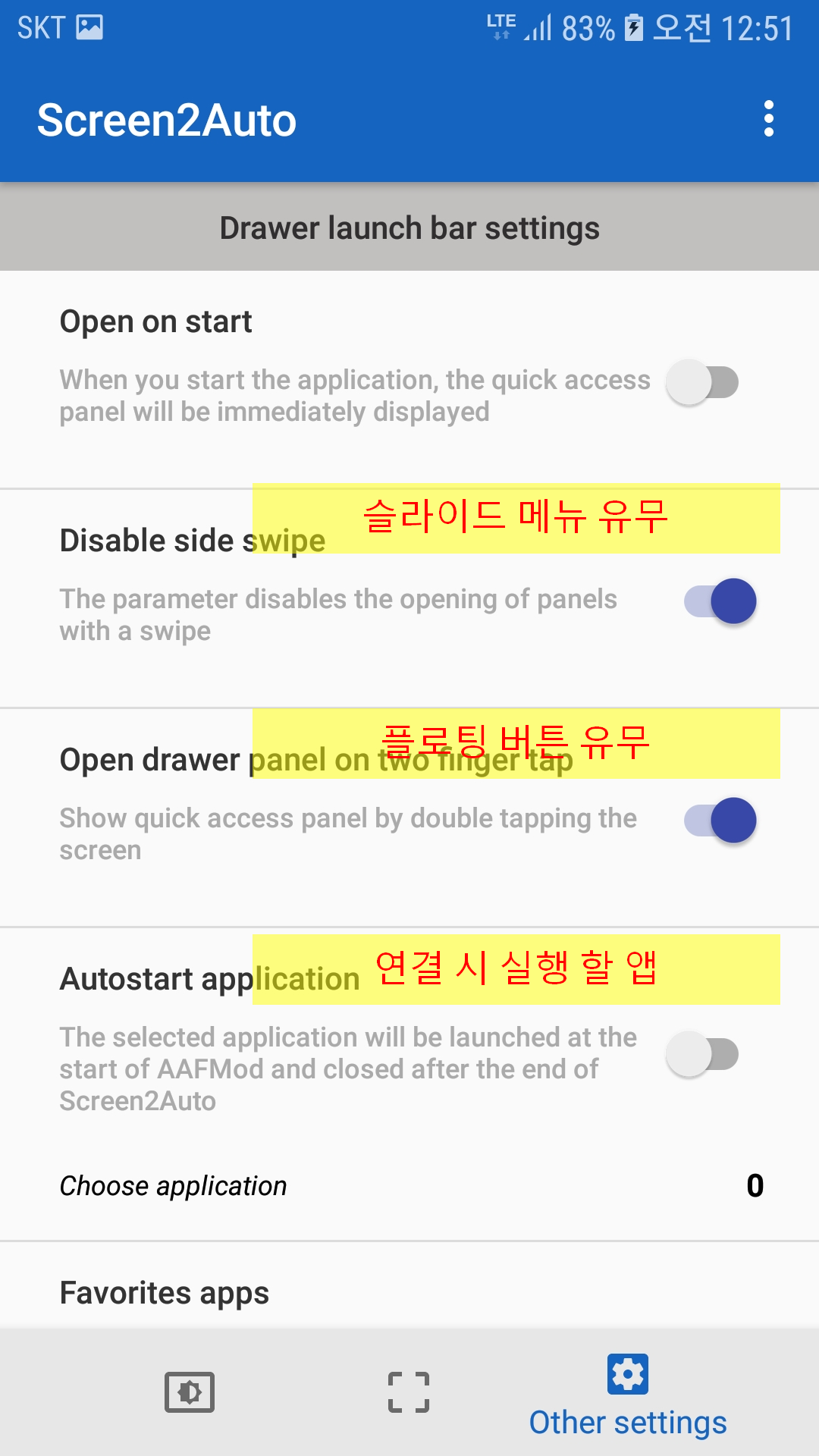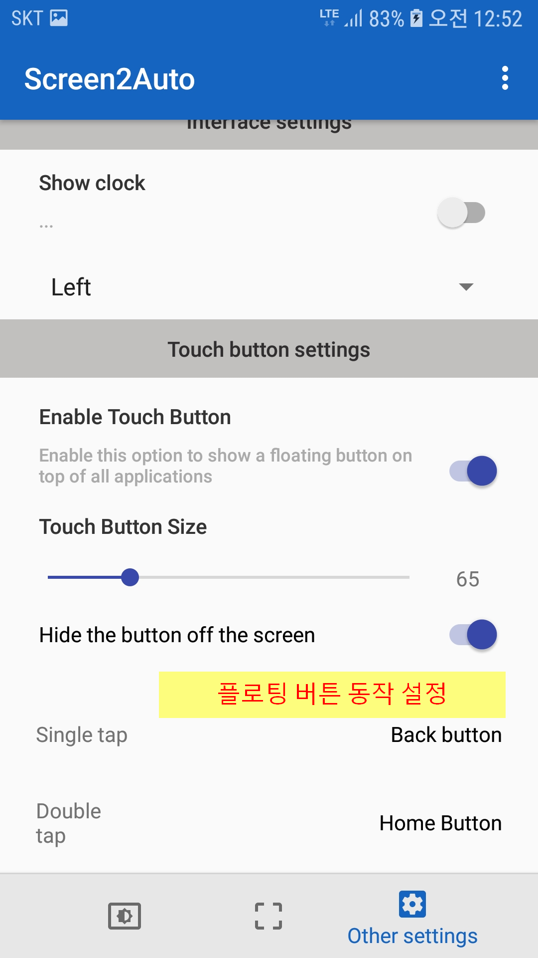 1. 슬라이드 메뉴는 머 네비화면 반응성도 느리고 해서 쓸모 없어서 나는 껏다. 네비화면을 가로로 쓸면 휴대폰 앱들이 나오는데 뭐 쓴다면야 유용할 것 같기도 하다. 플로팅 버튼은 화면위에 항상 띄어져있는 버튼인데 머 취소키 역할도 할 수 있어 해놓으면 쓰긴쓴다.
