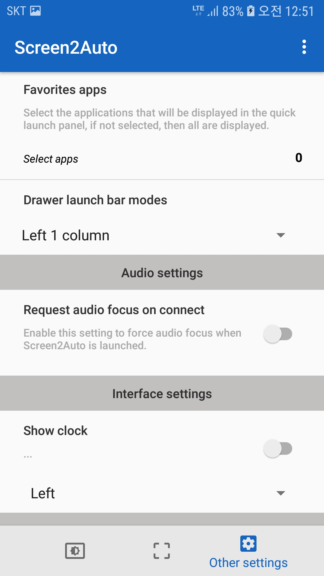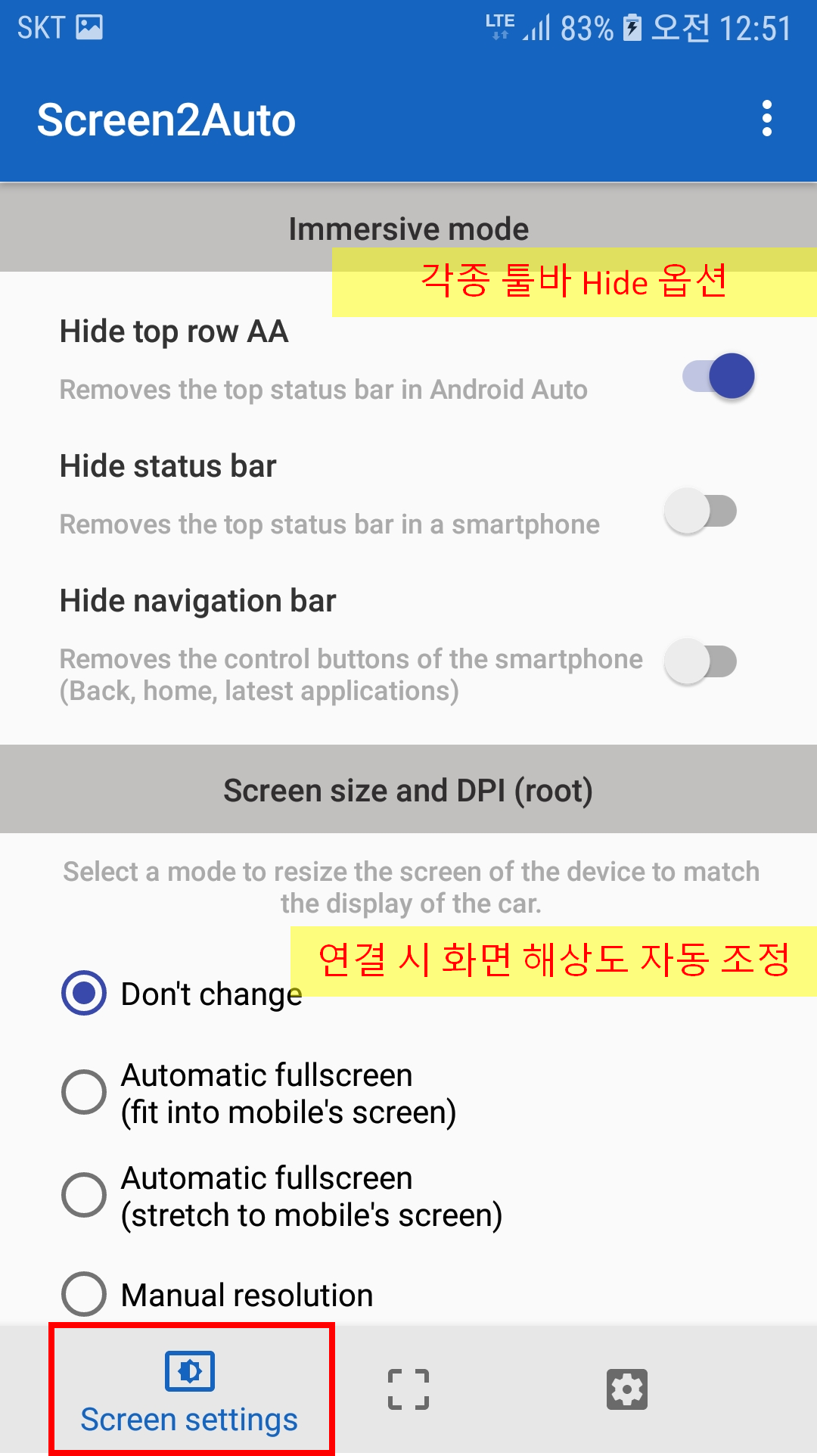 2. 위에 상태바랑 뭐 잡다한 바들인데 가뜩이나 좁은 네비화면 크게 써야하니 3개다 OFF하는 것이 좋다. 그리고 밑에 연결 시 화면 해상도를 자동으로 조정해주는 옵션이 있는데 이게 양날의 검이다... 오토메틱으로 놔두면 결론적으로 네비화면에 스마트폰 화면이 꽉차게 나오긴 한다. AAmirror가 가지고 있던 한계를 극복한 것이다. 그런데 네비 해상도를 따라갈 경우 내비 하단 툴바 부분이 제외된 해상도로 짤리기 때문에 16:9 , 4:3 처럼 국룰 규격의 비율이 깨지게 된다. 이럴 경우 내가 갤럭시 S7이라서 안드 버전이 낮아서 그런건지 특정화면에서 해상도가 이상하게 먹히는 경우가 있다...그래서 난 그냥 Don't Change 옵션을 선택했다. 본인 차량에서 테스트해보고 문제 없으면 오토매틱으로 두면 될 것 같다.