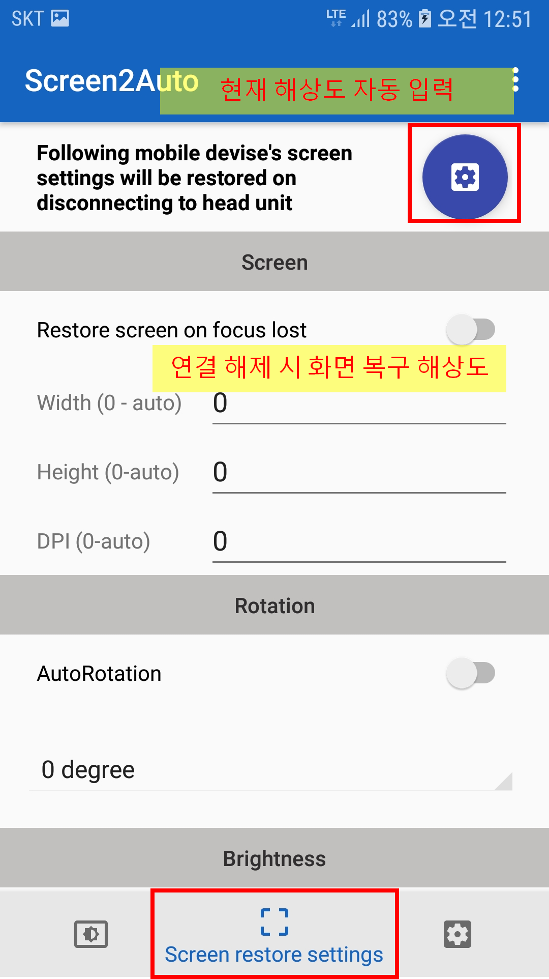1. 벌써 하단 두번째 메뉴로 넘어왔다. 위 화면은 연결이 끊겼을때 화면 해상도를 어떻게 할꺼냐는 옵션인데, 저 톱니바퀴를 눌러주면 지금 현재 폰해상도를 알아서 찾아준다. 눌러보자