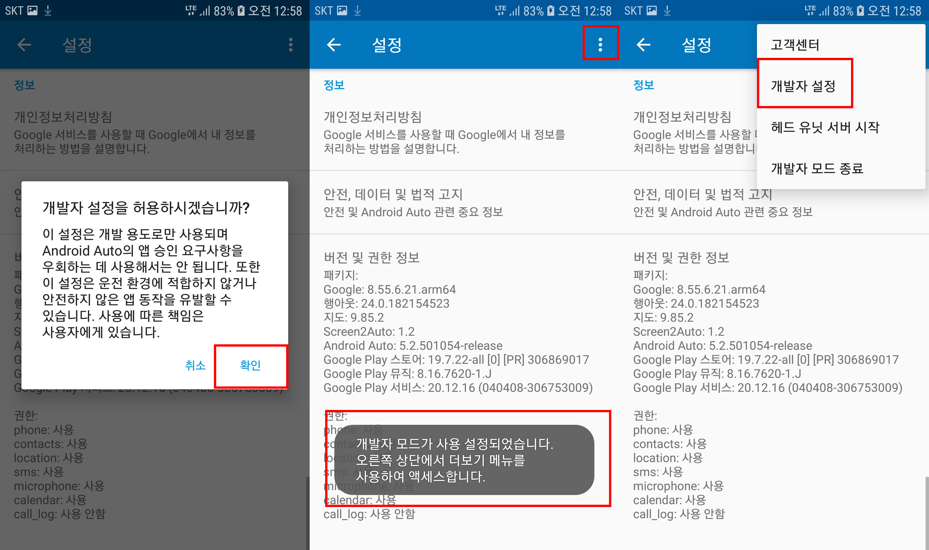 1. 개발자 설정 팝업에서 확인을 눌러준다.