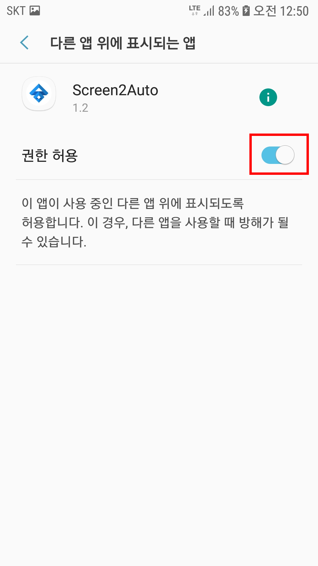 2. 다른 앱 위에 표시되는 앱 권한을 허용해준다.