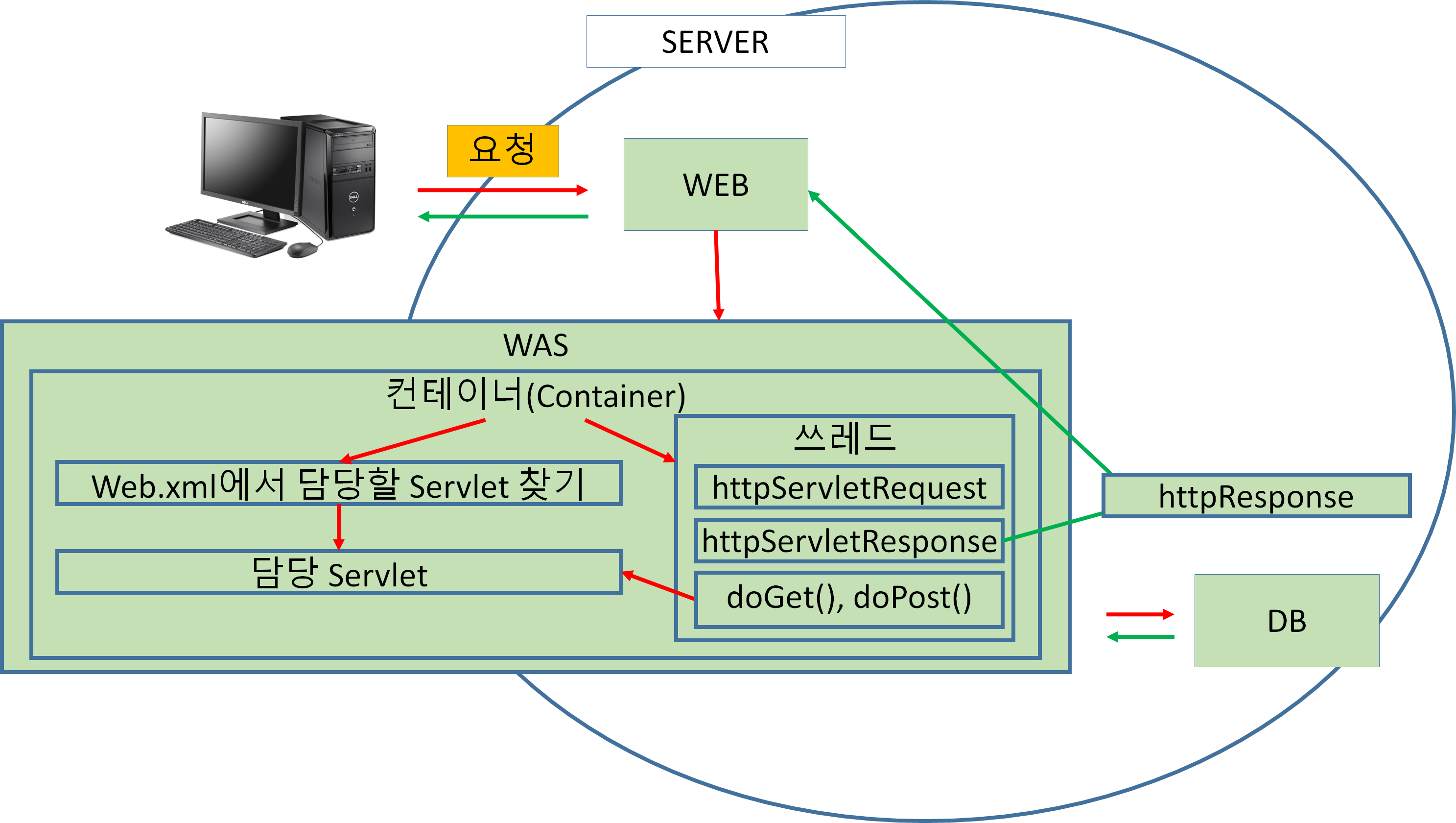 와우 이제 좀..어려워 졌다.. 하지만 WAS를 좀 구체적으로 그린것 밖에 없고 나머지는 다 똑같다. WAS에 대해 더 알아보자면 컨테이너란 녀석이 WAS가 돌아가는 동안은 24시간동안 당직을 서고 있는다. 이 컨테이너라는 친구가 WEB에서 못해먹겠다고 동적 요청을 받으면 그 요청에대한 정보로 httpServletRequest 객체(정보 뭉텅이라고 생각하면 됨)와 httpServletResponse라는 빈 객체를 만들고 그걸 새 쓰레드(작업 단위라고 생각하면 됨)로 생성한다.