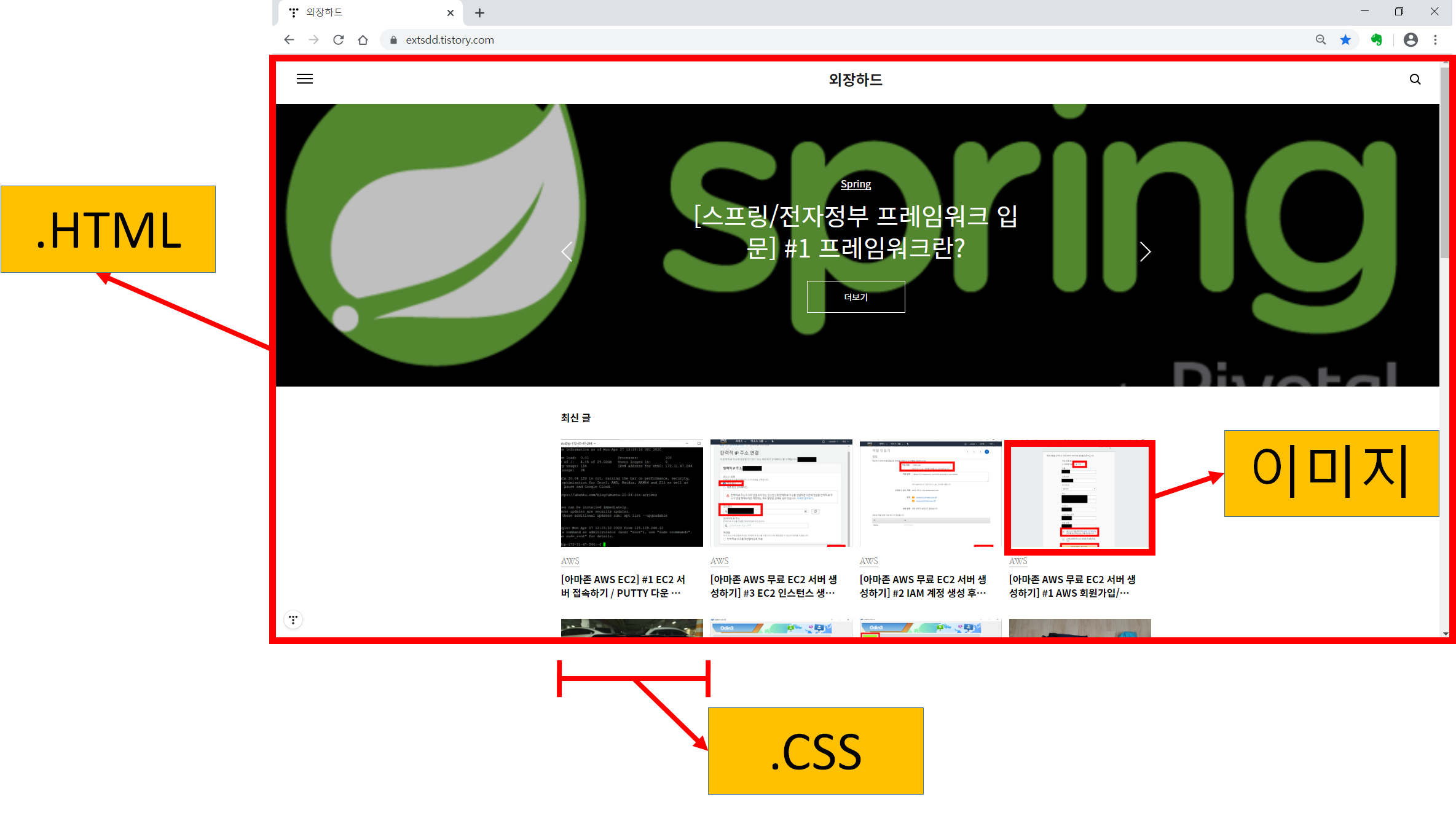 예를들어 우리가 extsdd.tistory.com이라는 웹 주소를 요청하면 서버는 그 요청에 해당하는 화면을 html 파일로 뿌려준다. html과 동시에 위에나온 화면 레이아웃을 설정해주는 css파일 그리고 화면에 띄어줄 이미지들 이것들은 내용이 변하지 않고 정적인 파일이기 때문에 이 WEB서버란 친구가 착실하게 뿌려주는 것이다.