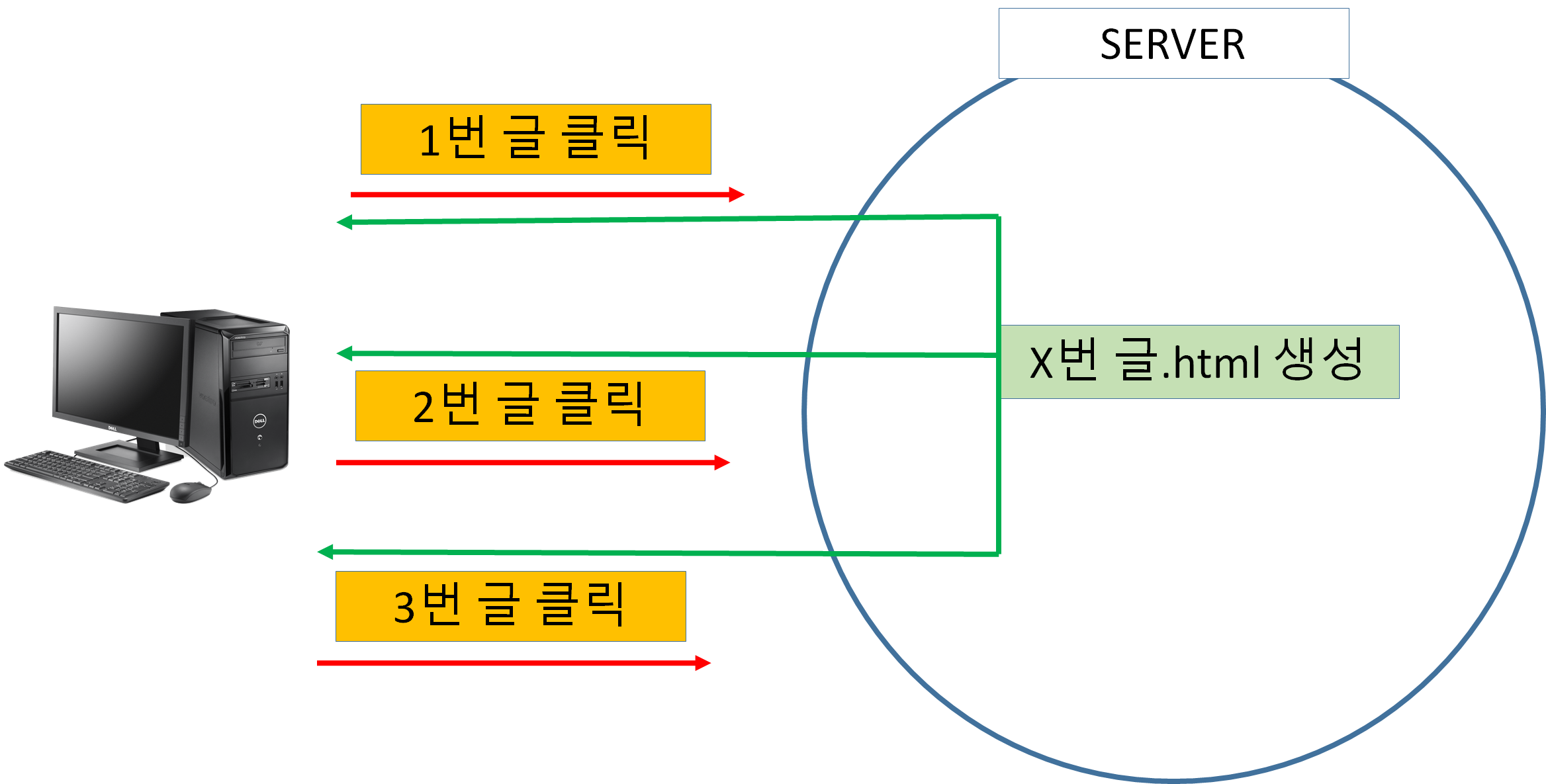 사용자 입장에선 이 서버로부터 받아낸 html, css, 이미지 등을 조합해 내 화면에 구성해서 띄어주는거다. 이 방법은 정적이기 때문에 그 사이트의 모든 화면들은 모두 html 파일로 서버에 저장해놓고 그걸 그대로 뿌려주는 것이다. 예를들면 로그인 화면, 첫 번째 글을 눌렀을 때 화면, 두 번째 글을 눌렀을 때 화면 등. 그 사이트에서 존재하는 모든 화면이란 화면은 모두 서버에 html 패거리(css, 이미지 등)를 다 저장해 놨던것이다.