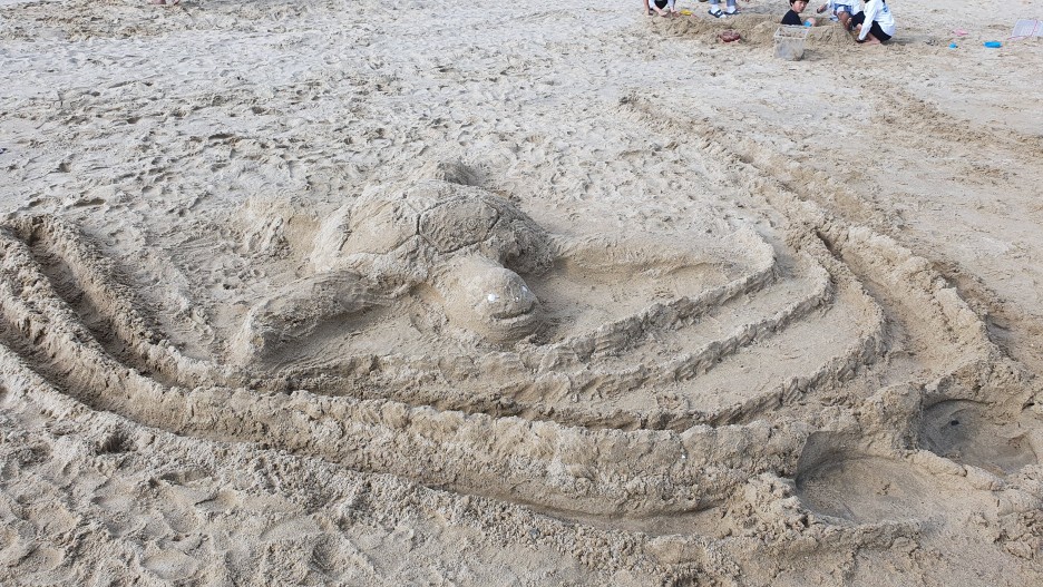 이 앞쪽 백사장은 거의 키즈카페였다.. 애들이 다 ㅋㅋㅋ 하나씩 굴을 파놓고 수로를 만들고 있고 부모님들은 뒤쪽 숲속 텐트에서 지켜보고 있다.