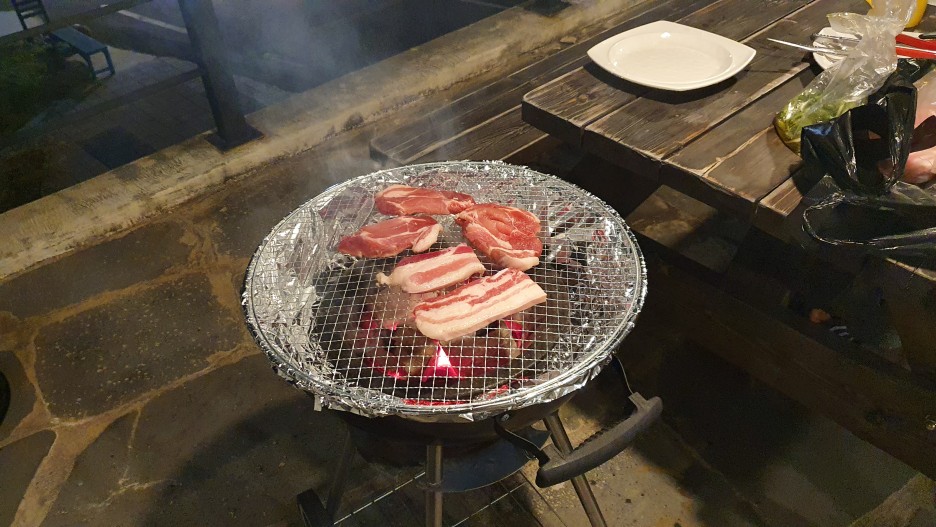 보통 펜션 바베큐 그릴을 보면 아주 쎄까메져서 사탄도 여기가 지옥인가 착각할 정도인대 여긴 아주 깔끔하다. 아예 외부라서 그런지 연기때문에 눈이 맵지도 않았고, 너무 위생적이어서 좋았다. 아 그리고 아저씨가 숯 값도 깍아주시고 아저씨 인심에 감동해따...★