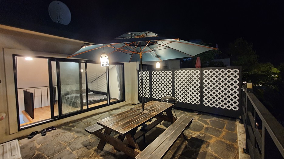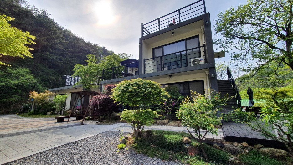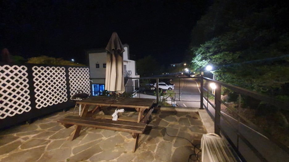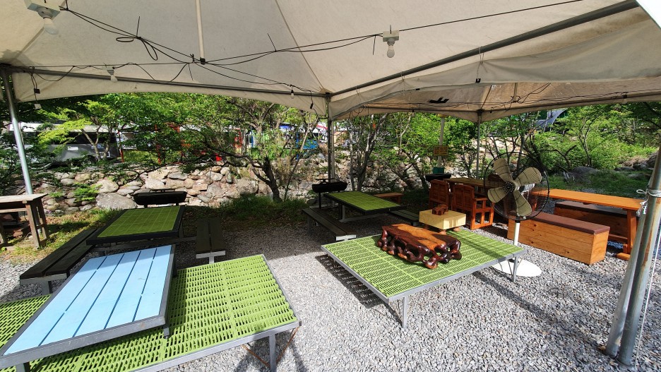 계곡옆에 이렇게 야외 바베큐장도 있어서, 발코니에서 먹기 싫은사람들은 여기서도 바베큐 파티를 할 수 있다.