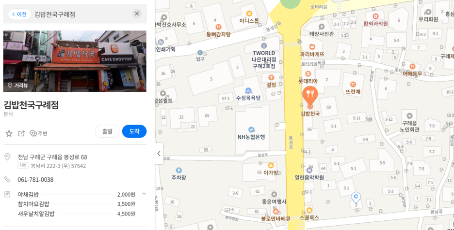 등산가면서 먹을 김밥을 사려면 미리 구례 시내에서 구입해야한다. 우리는 맛있는 김밥 먹으려고 구례 시내에 있는 "아빠 김밥"이라는 곳으로 갔는데 그낭 연휴라서 그런지 휴무였다 ㅠ 그래서 바로 한 100m정도 떨어진 저 위에 김밥천국을 갔다.