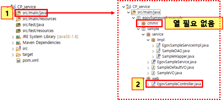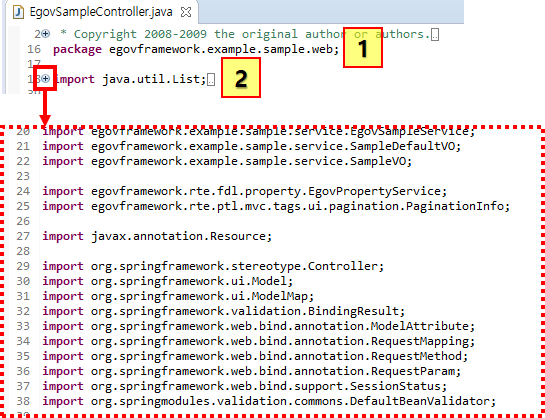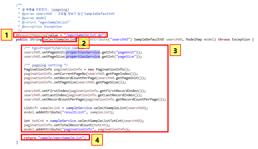 자 이제 겁먹지 말라고 3개 문단에 나눠서 말했으니 이제 본격적으로 예제를 분석해보자. 2번 박스에 있는 EgovSampleController.java를 보자!