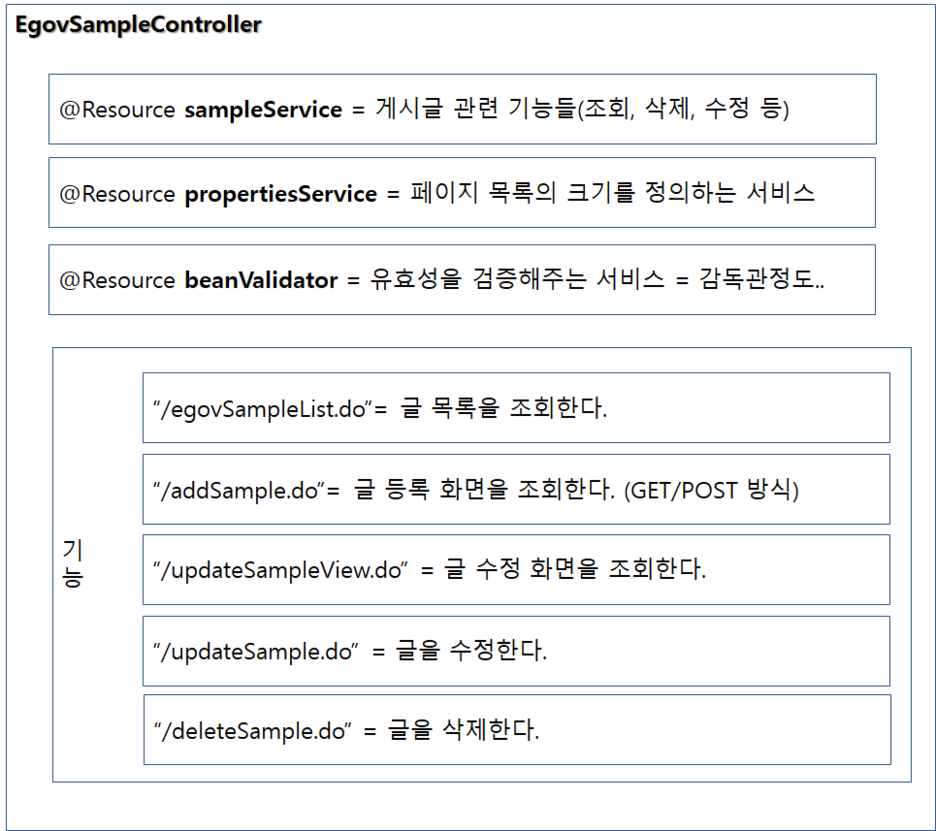 자 정리해보자. 우리의 기본 컨트롤러인 EgovSampleController는 게시글 관련기능, 페이지 목록, 유효성을 검증해주는 3개의 서비스를 호출해놨고 이 컨트롤러에서는 글 조회, 등록화면 조회, 글 수정화면 조회, 글 수정, 삭제 등 5가지의 기능을 수행하는 컨트롤러다!