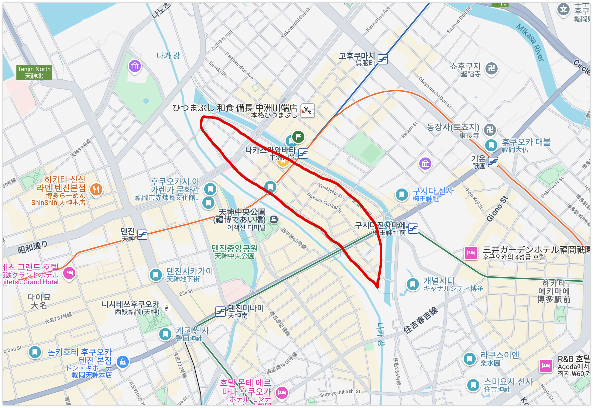 이전에 구시다 신사를 지나 케고신사를 가는 길에 나카스 강을 지나길레 둘러보기로 했다. 오사카에서 도톤보리 강이 있다면 후쿠오카라면 나카스 강이 있다. 이름만 많이 들어보았는데 드디어 와보게 되었다.