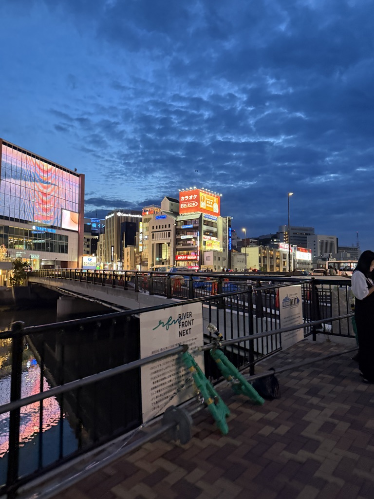 해가 지기 시작했다. 이때는 이미 여러 곳을 다녀오고 난 뒤였는데, 이때가 약 19:00 경이었다. 방문했을때가 5월이었는데도 해가 아주 늦게 지네.. 강가에서 둘러보면 멀리 캐널시티도 보인다. 건물이 눈에 띄게 생겨서 한눈에 알아볼 수 있는데, 나는 처음에 저 나선형 건축물때문에 안에 워터 파크가 있는줄 알았다.. 가보니까 그런건 아니더라고..